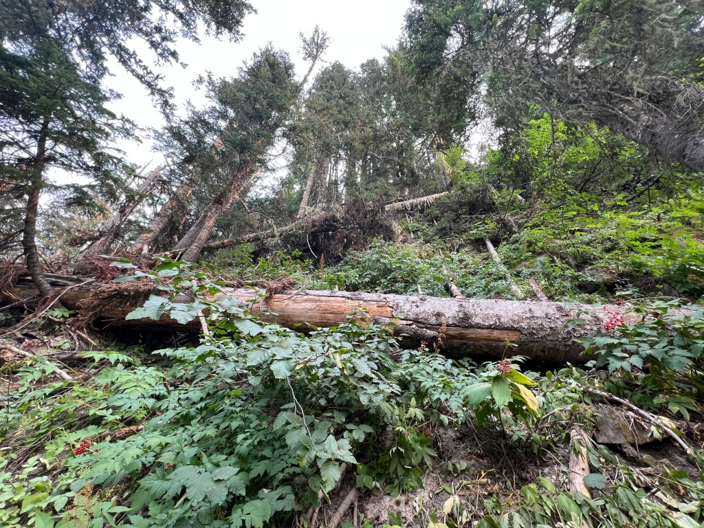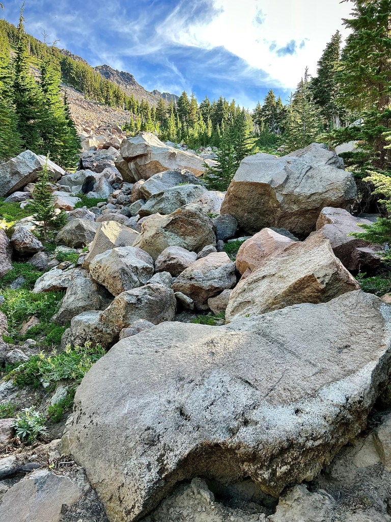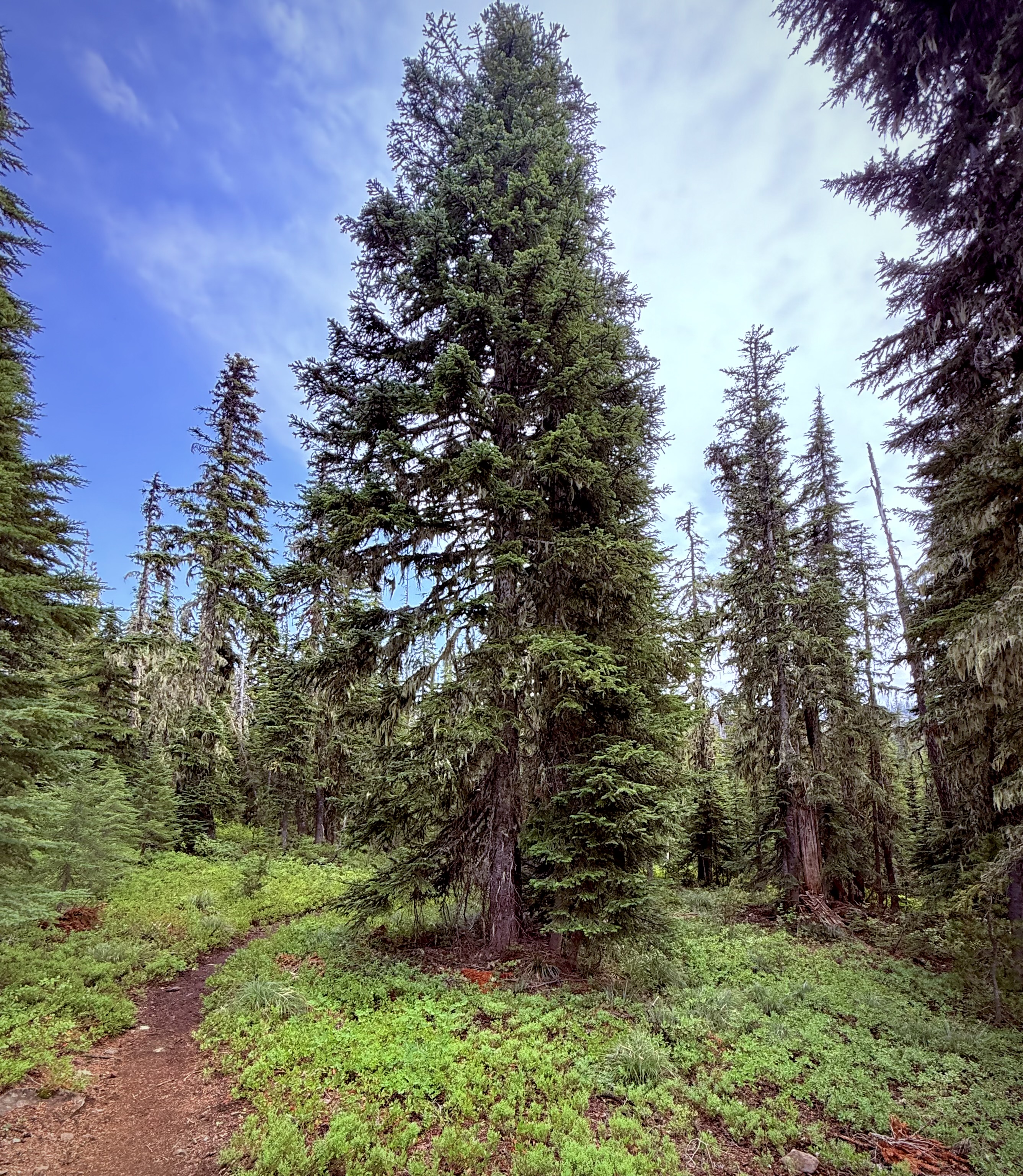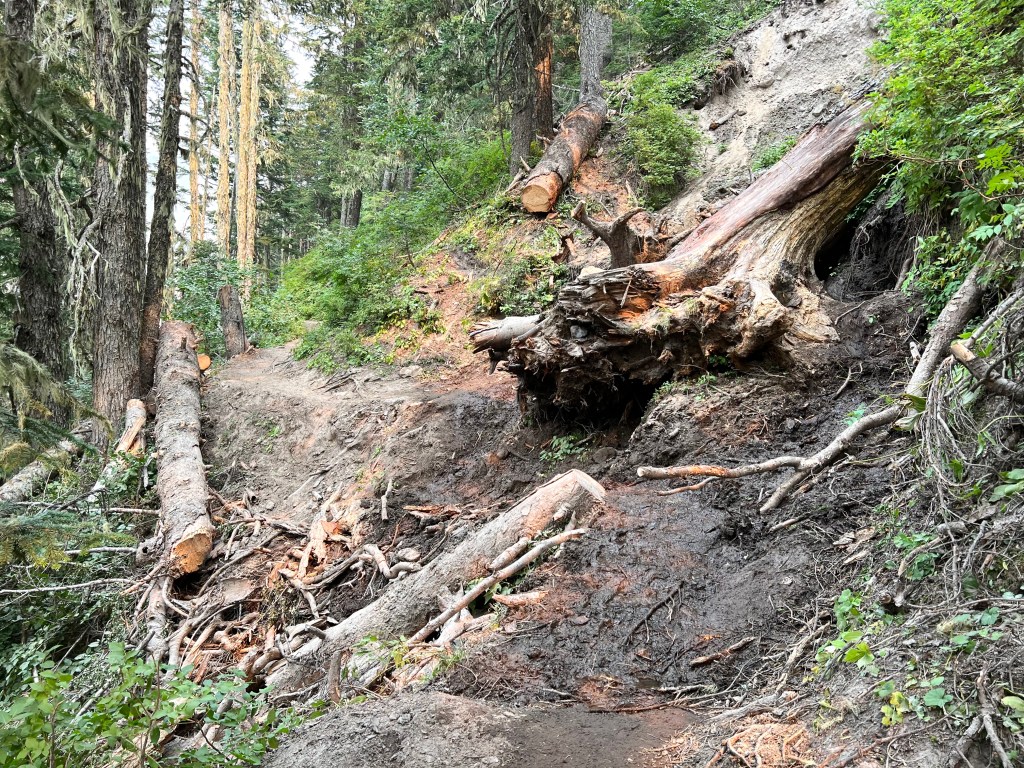 We maneuvered through a portion of forest with downed timber that we had to clamber over, under or around, and up a steep switch back trail. One spot seemed particularly treacherous with massive logs precariously perched above being held in place by saplings. It was quite unnerving to come around the bend and find trail all but wiped out by such a tree coming down the mountainside.