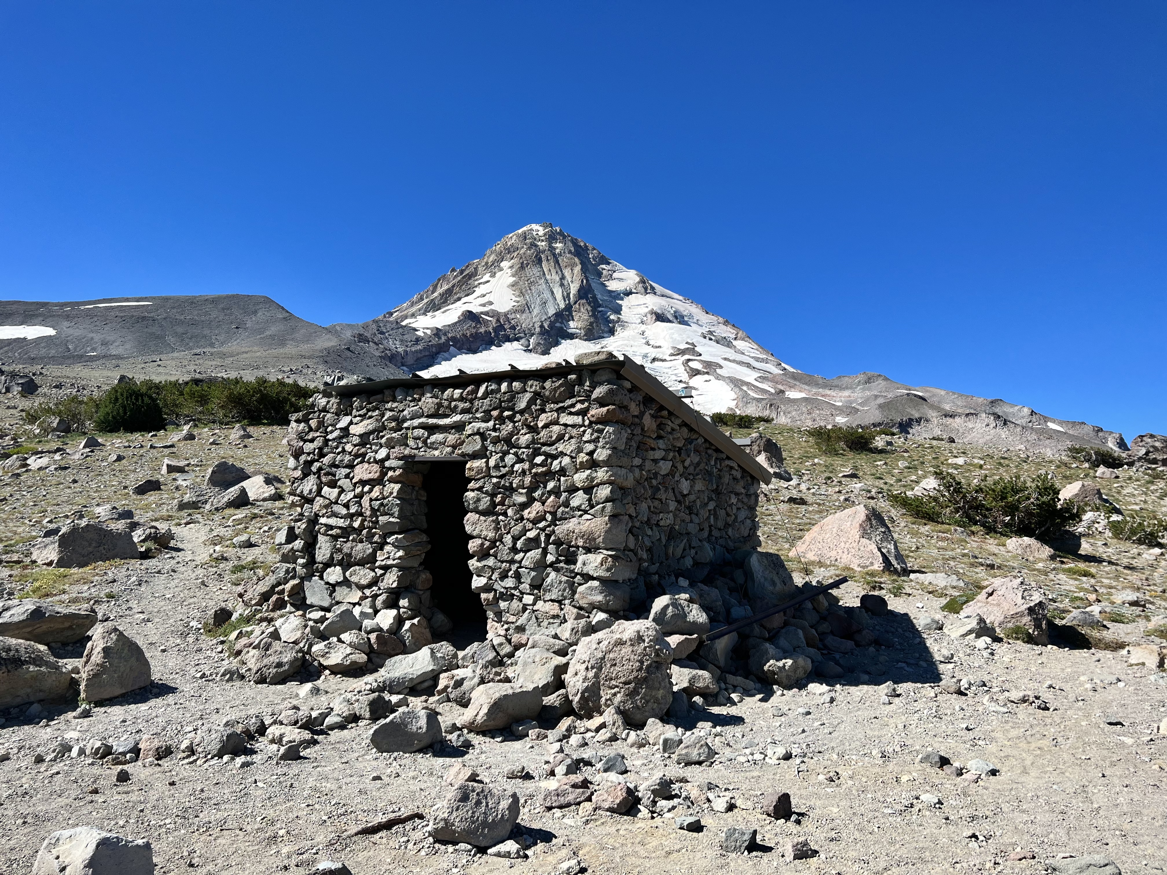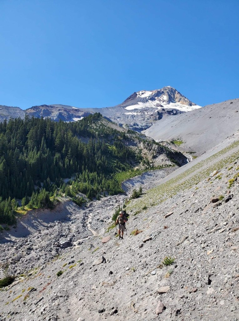Wednesday, Sept 7th, at 8AM we set out past Timberline Lodge to circumnavigate Oregon’s magnificent Mt Hood counterclockwise on the amazing Timberline Trail under mostly sunny skies. The days were to be mild and the nights just a little chilly so really tremendous conditions to take on one of the best backpacking trips in America.  Meandering through fields of wildflowers, in and out of wooded areas, spectacular views of Mt Jefferson, passed a couple small crossings of rushing water and waterfalls was how we spent the day.  Hoping across rocks is a little tricky with a heavy pack, but we managed to stay dry.  Now we climb… 10 miles and over 2,800’ elevation gain much of it up loose, steep, sandy, and crumbly material known as scree. We bedded down past Lamberson Butte near an old shelter with unreal views of the peak of Mt Hood right out my tent flap.