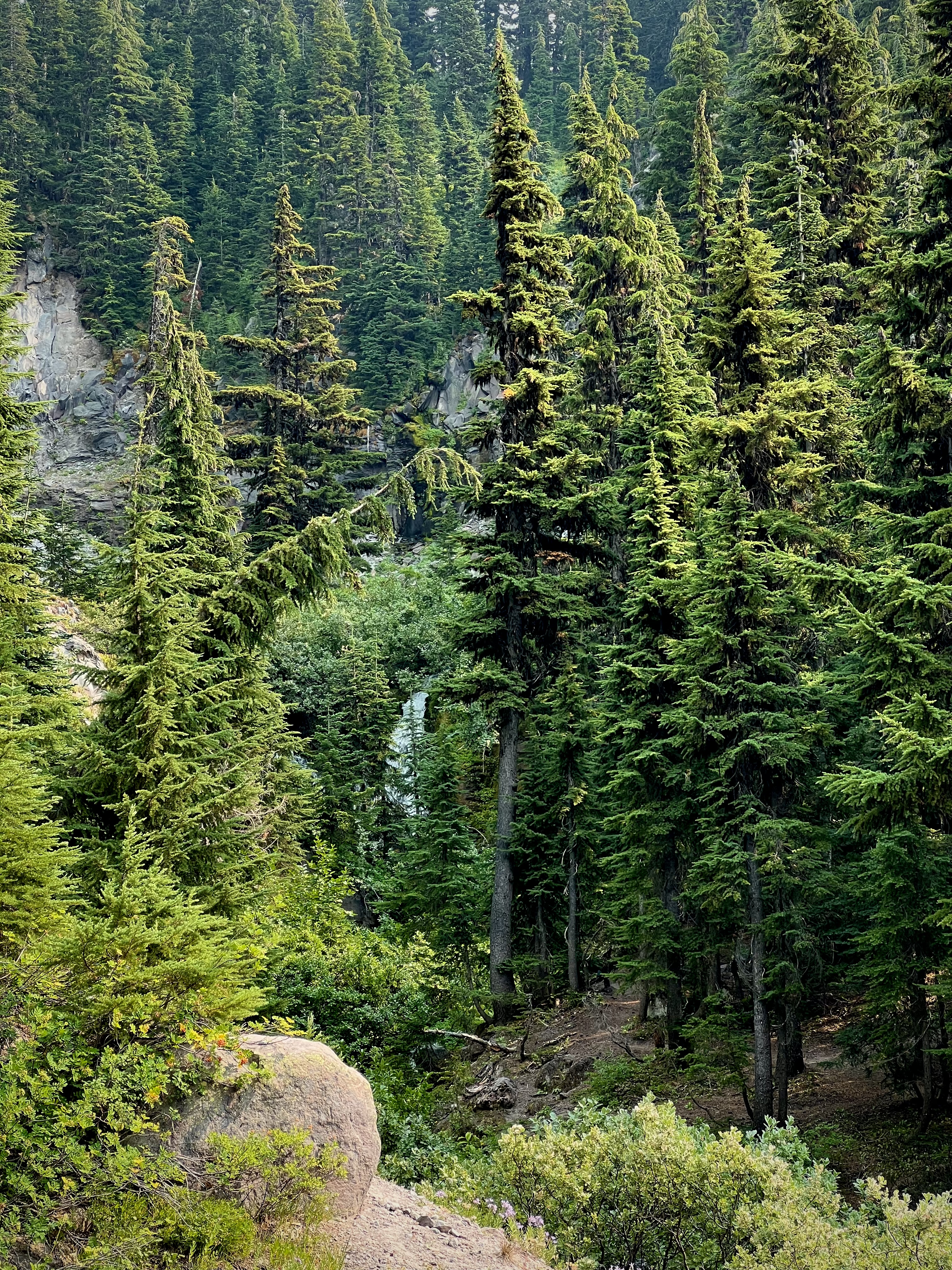 The last water crossing of any note, Milk Creek, cut through the forest, running down off of the mountain, but it was not that big of a deal and with a little rock hopping I was across. Yes, we were back to live, green, lush forest as we wrapped around toward the backside of Mount Jefferson.