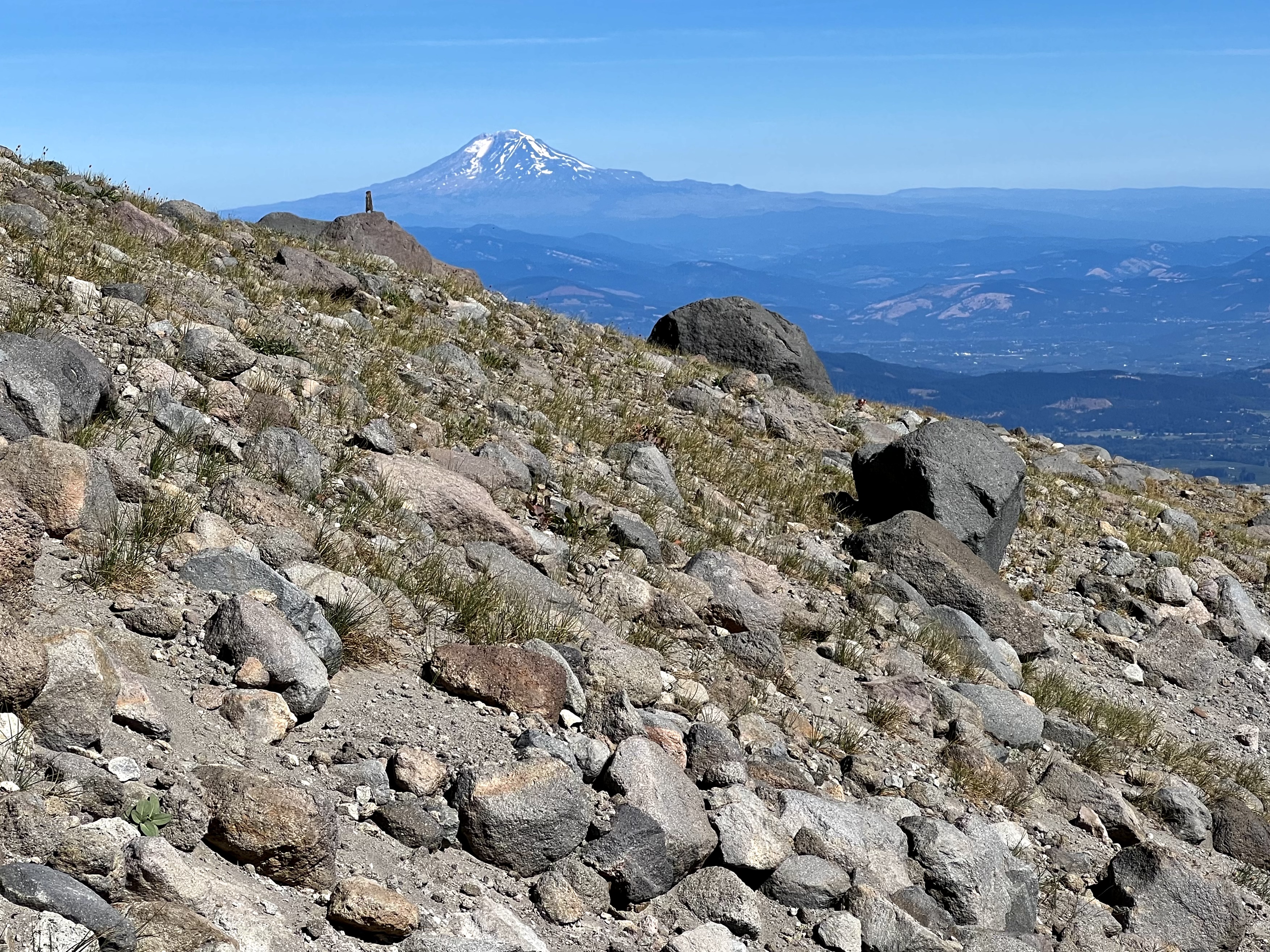 Thursday Sept 8th.  Another beautiful day Anthony and I hiked mostly above the timber, soaking up the sun, and the magnificent views not only of our mountain, but majestic Mt Rainer, stately Mt Adams, and once the most perfectly shaped mountain, the infamous Mt Saint Helens. We took our break at an awesome rock shelter at Cooper Spur.