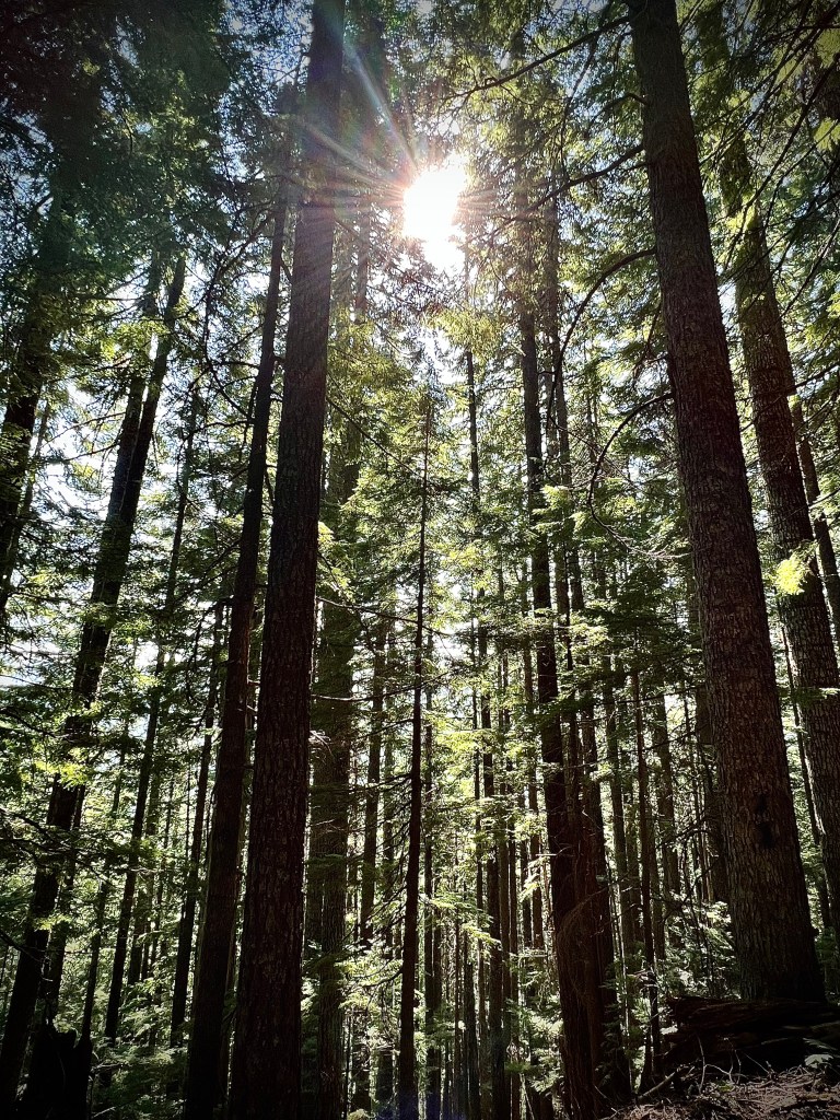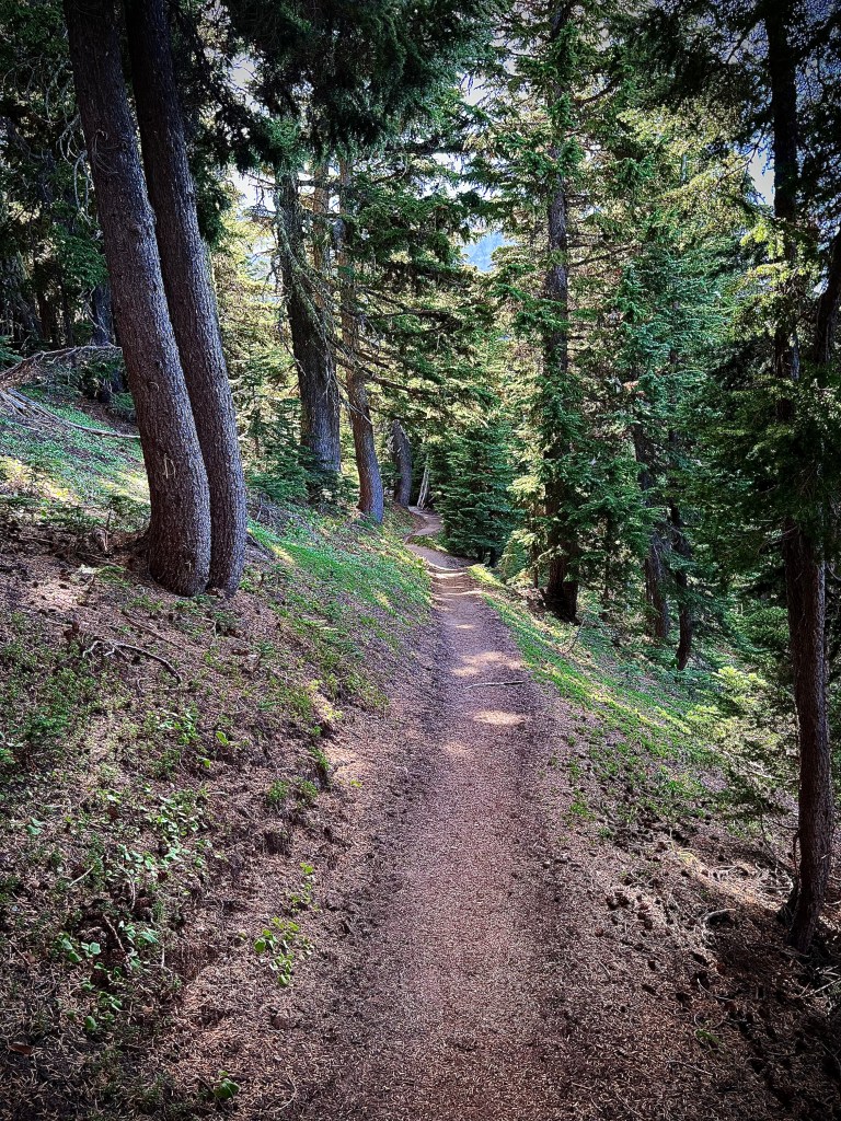 Peggy and Dale were packing up leisurely, enjoying our splendid campsite at the lake, as I headed up the mountain into the dense forest. I celebrated every footfall along the path carpeted in pine needles while serenaded by songbirds.