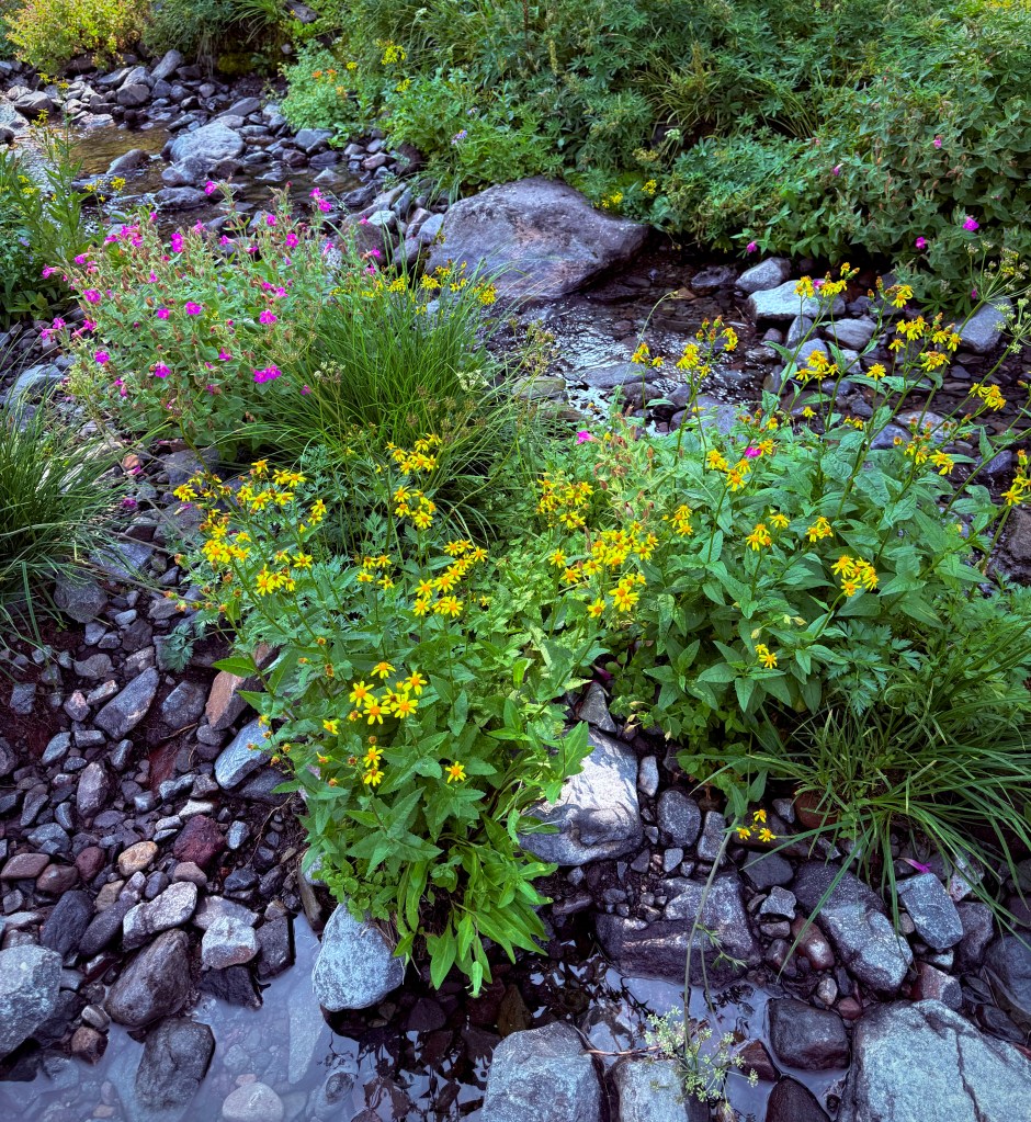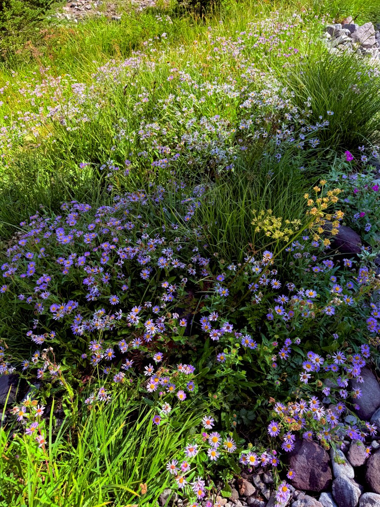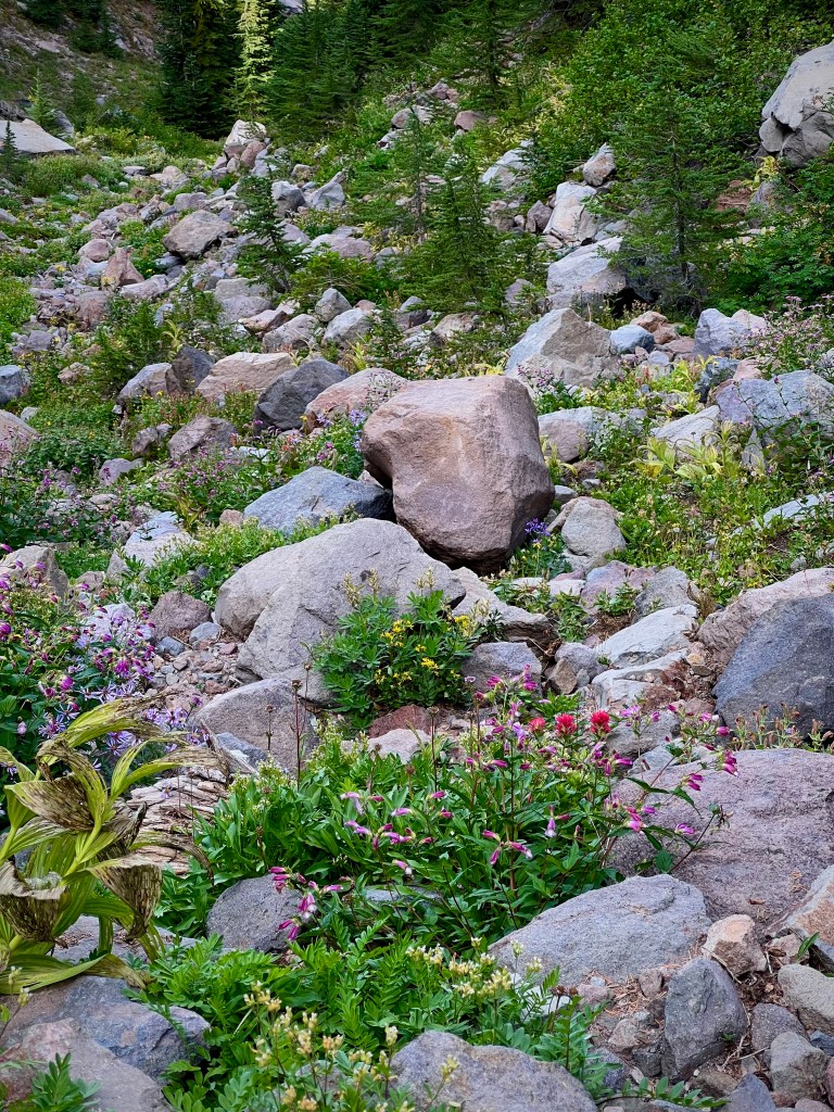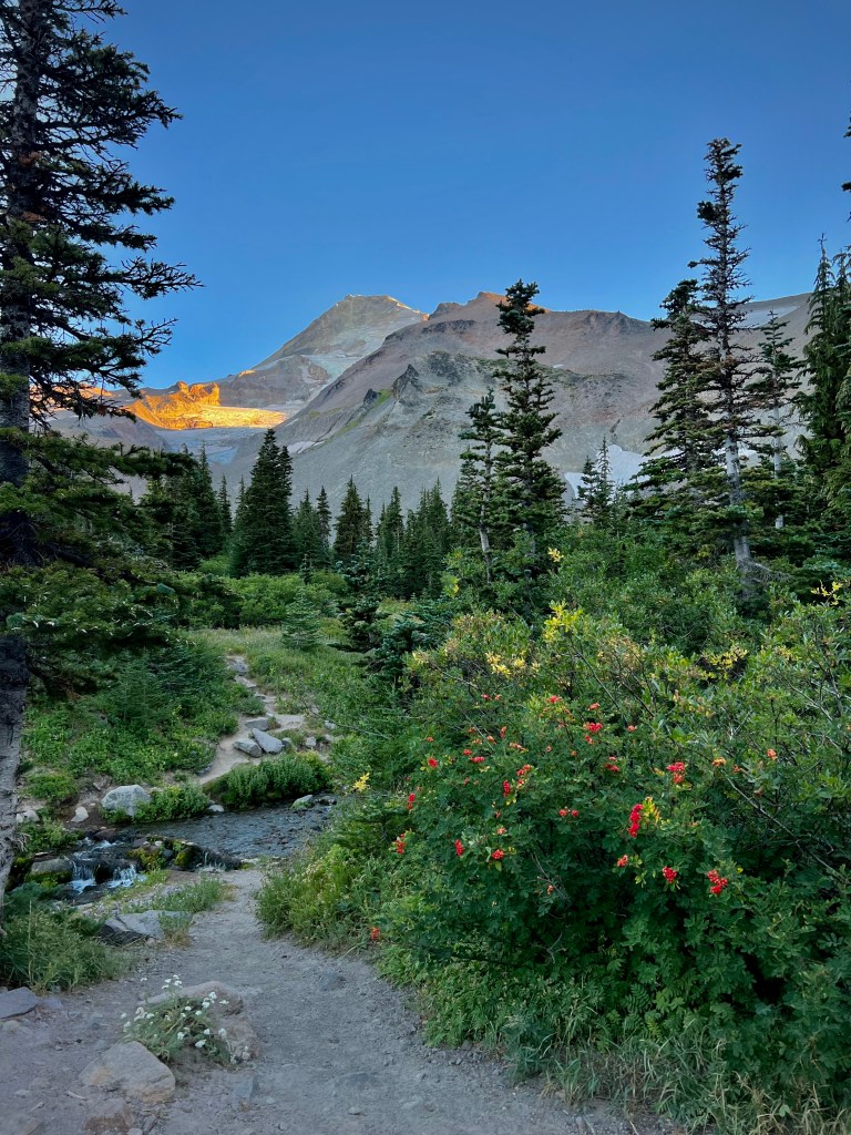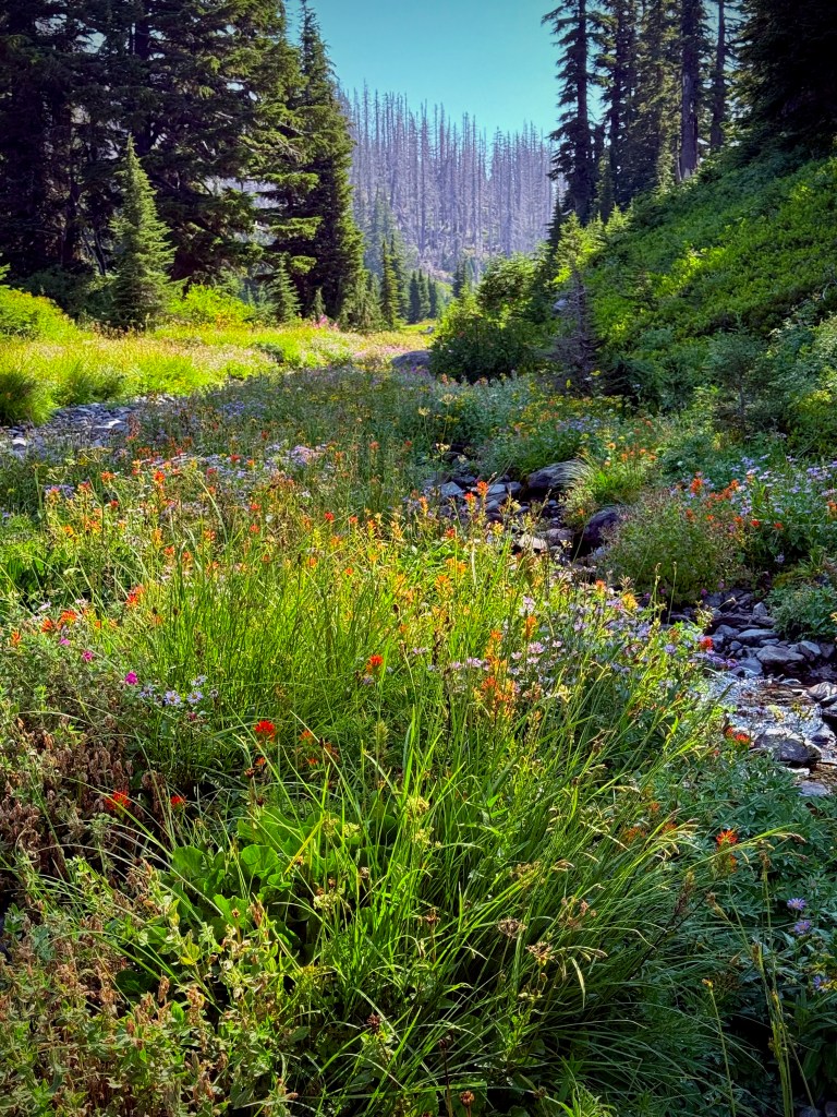 Then it was wildflowers, trees, and streams finishing up another 10 mile day with about 2,000’ elevation gain. We camped at Elk Cove with a sweet view of the mountain top beside a babbling brook.