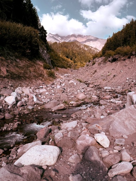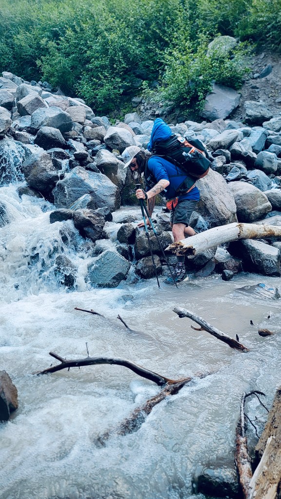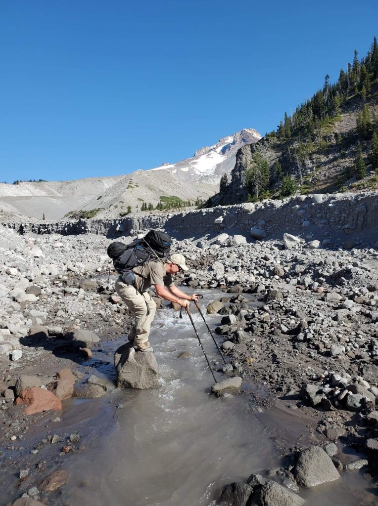 My Through Hiker friend, Anthony, and I appreciate you tagging along as we found ourselves ‘Pursuing Balance Through Adventure’ on our epic adventure circumnavigating this wonderful mountain. You know everything gets ramped up a couple degrees when you have a heavy pack on. Of course the hiking, and climbing up a steep ravine with a big pack is difficult and is a given, but what I am referring in particular is hoping rocks, or a maneuvering across a log, or in the case of this day, slogging through Elliott Glacier Stream. What would have been no big deal with out a pack is totally different wading through the frosty water across slippery rocks with the power of the water pushing you as you fight to balance the heavy pack. But pushing yourself is a big part of what this adventure was about and is a big part of what ‘Pursuing Balance Through Adventure’ is. Getting outside of your comfort zone, finding out what you can do is important and it sure helps balance things out. Nature, Adventure, self discovery… it is what it is all about. Stay with us. We are only half way through this journey around this iconic mountain. COMMENT, LIKE, FOLLOW and SHARE. The menu above will take you to spots I cherish all across this great West of ours. It just might give you some inspiration and some ideas for your next outing in Nature. You can purchase some wonderful Adventure Wear for your outing at my SHOP APPAREL.