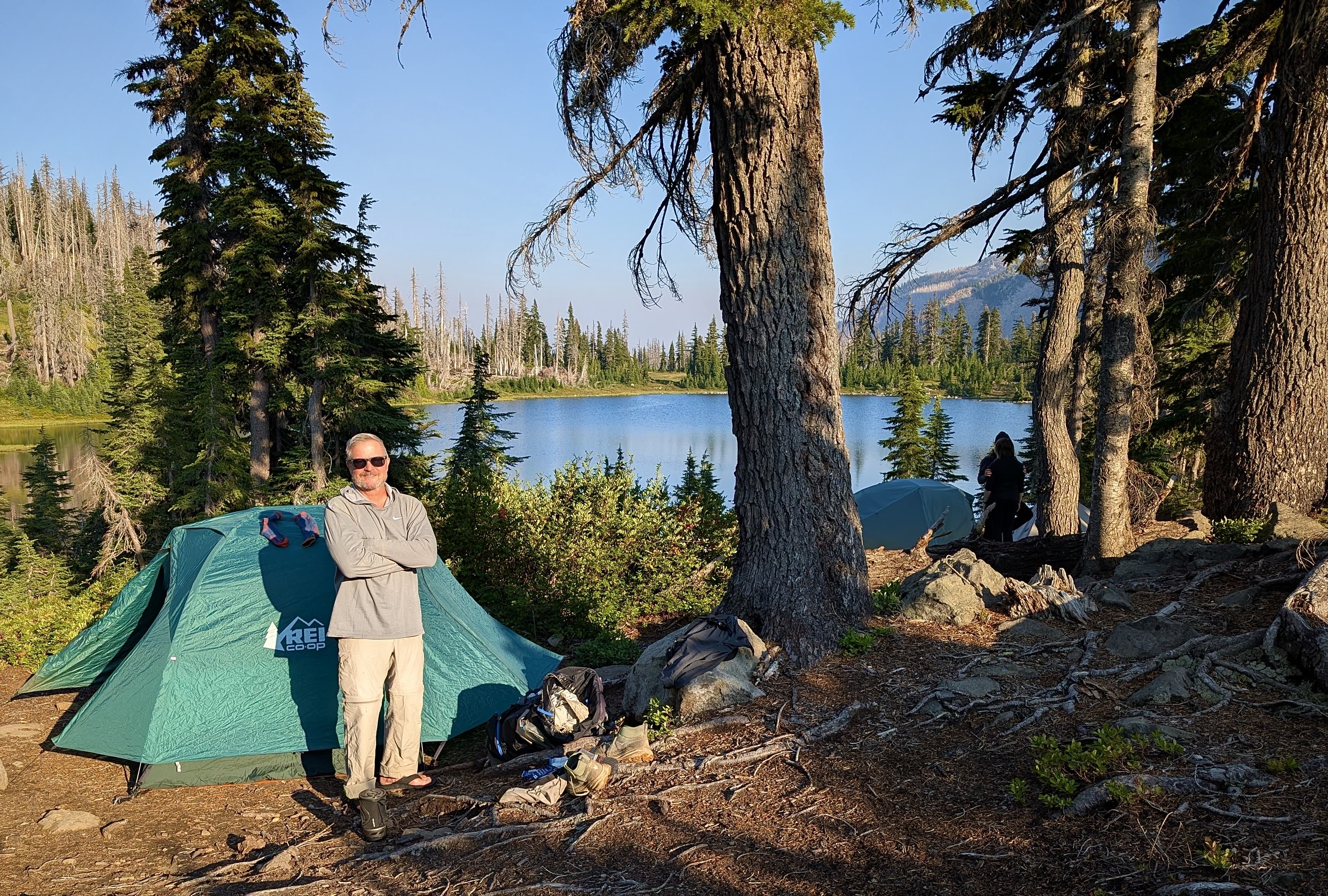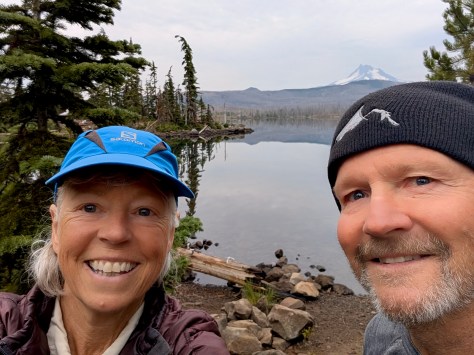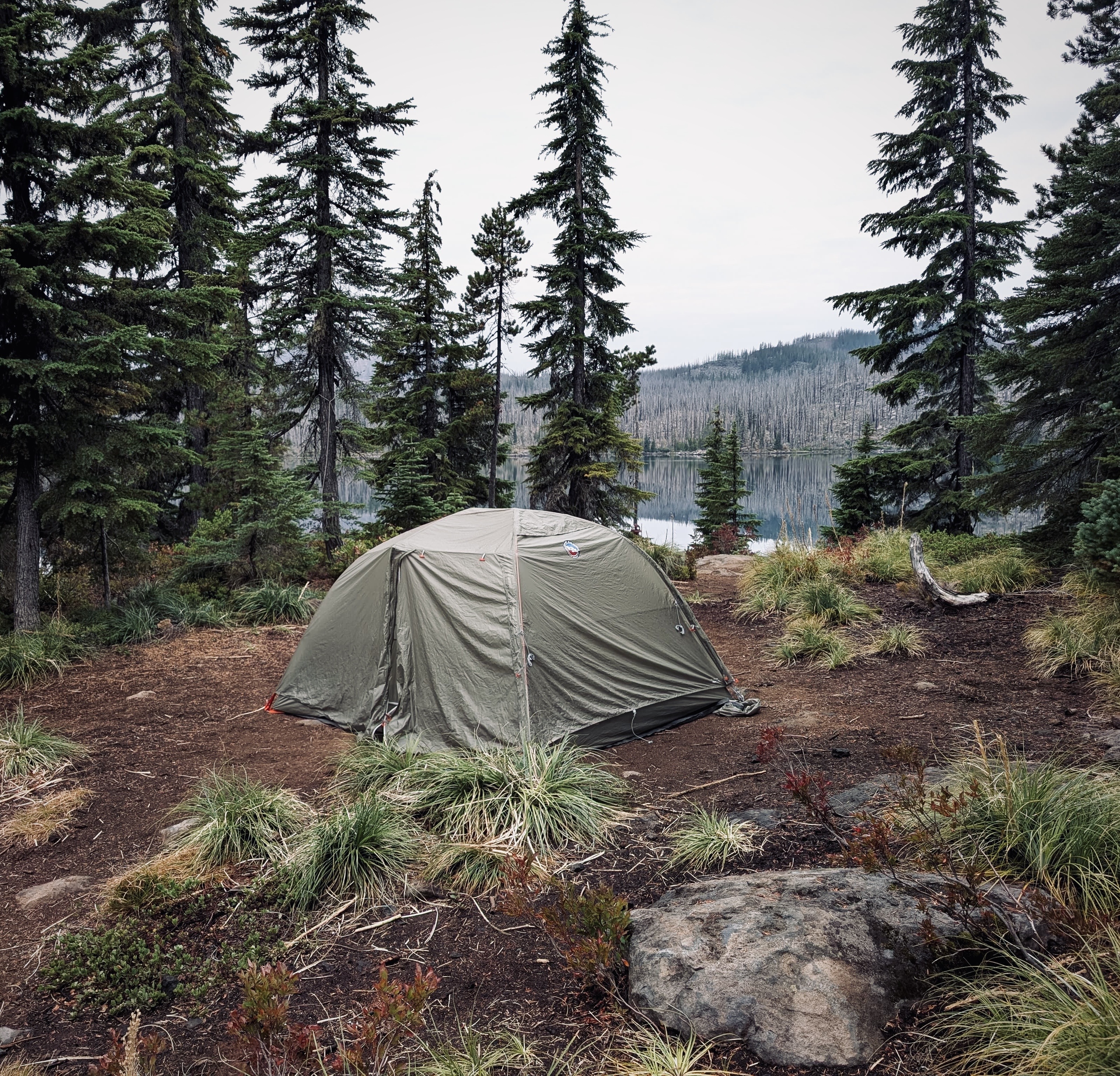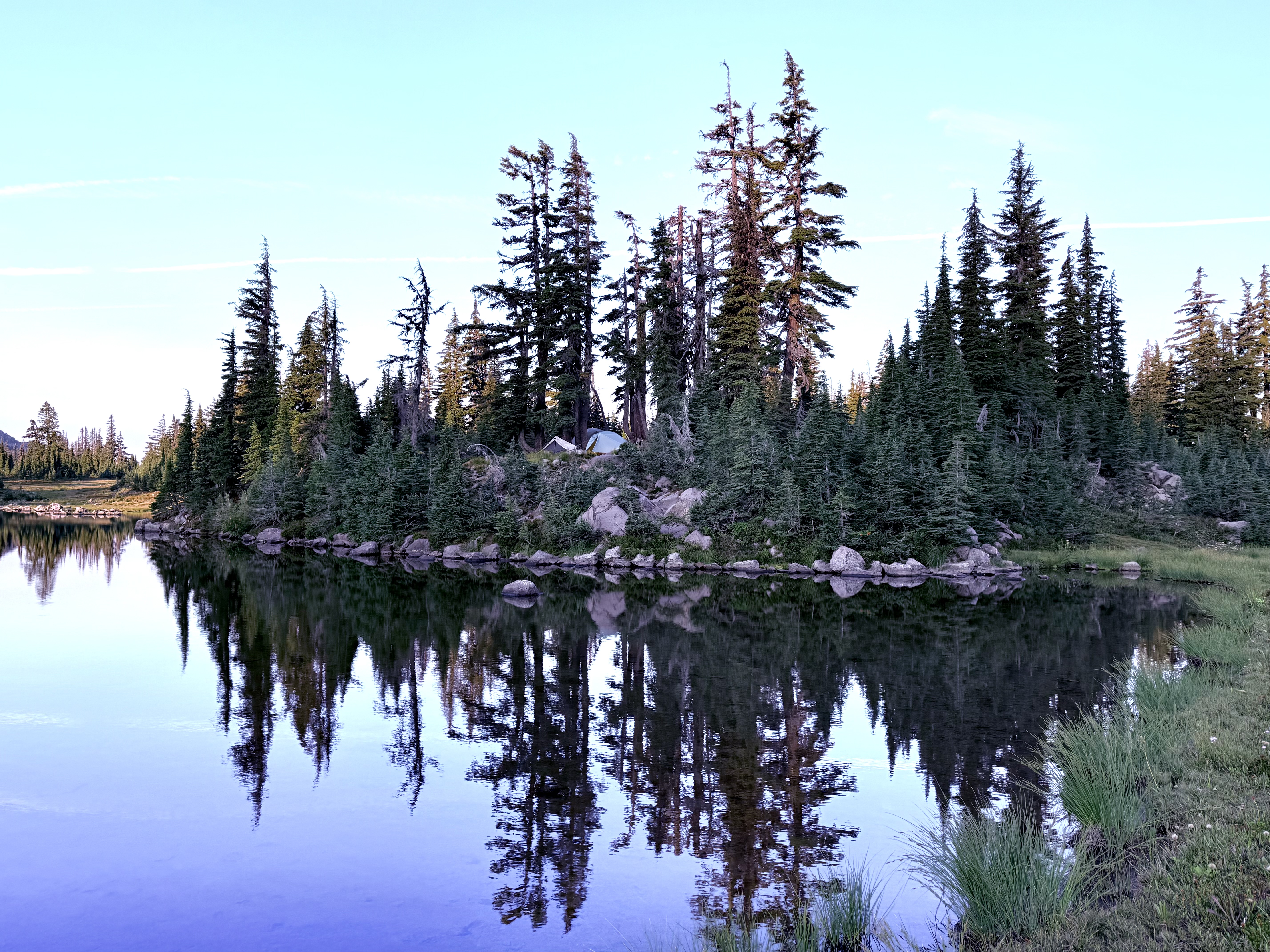 It was a wonderful and spacious campsite. Beautiful big fir trees on a little point on the quiet tranquil lake with a splendid view of Mount Jefferson, and away from others… perfect.