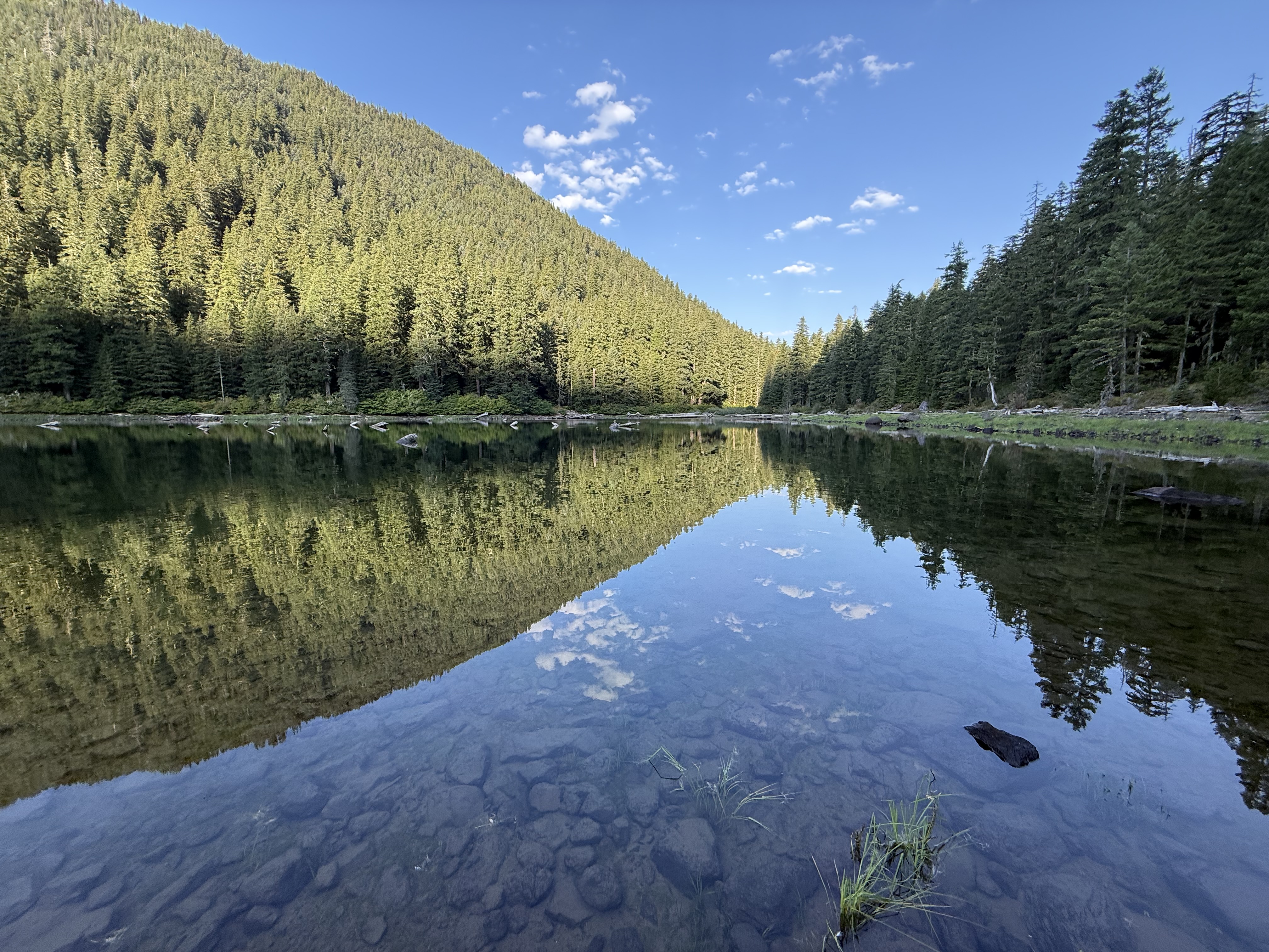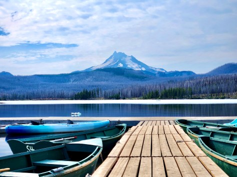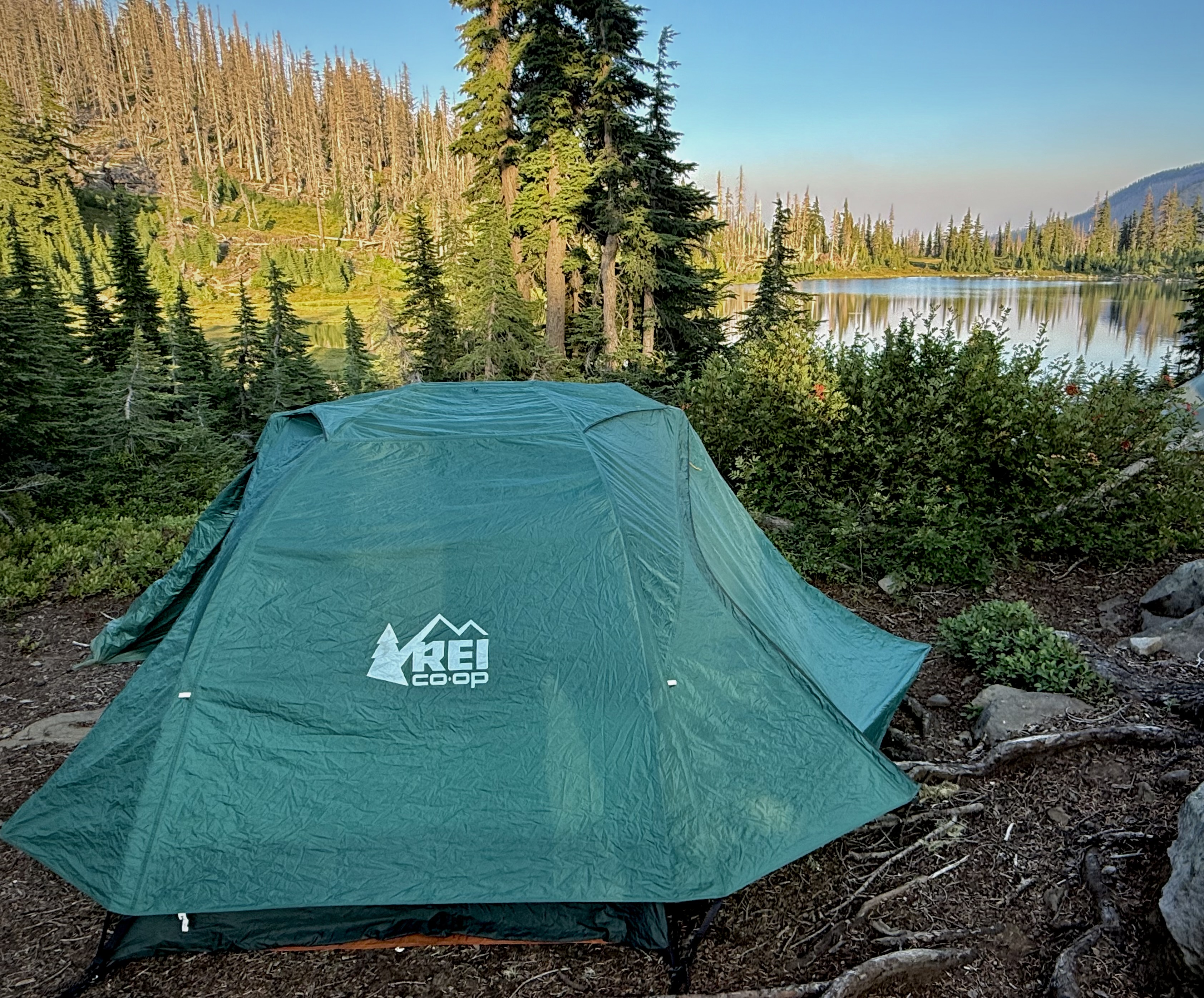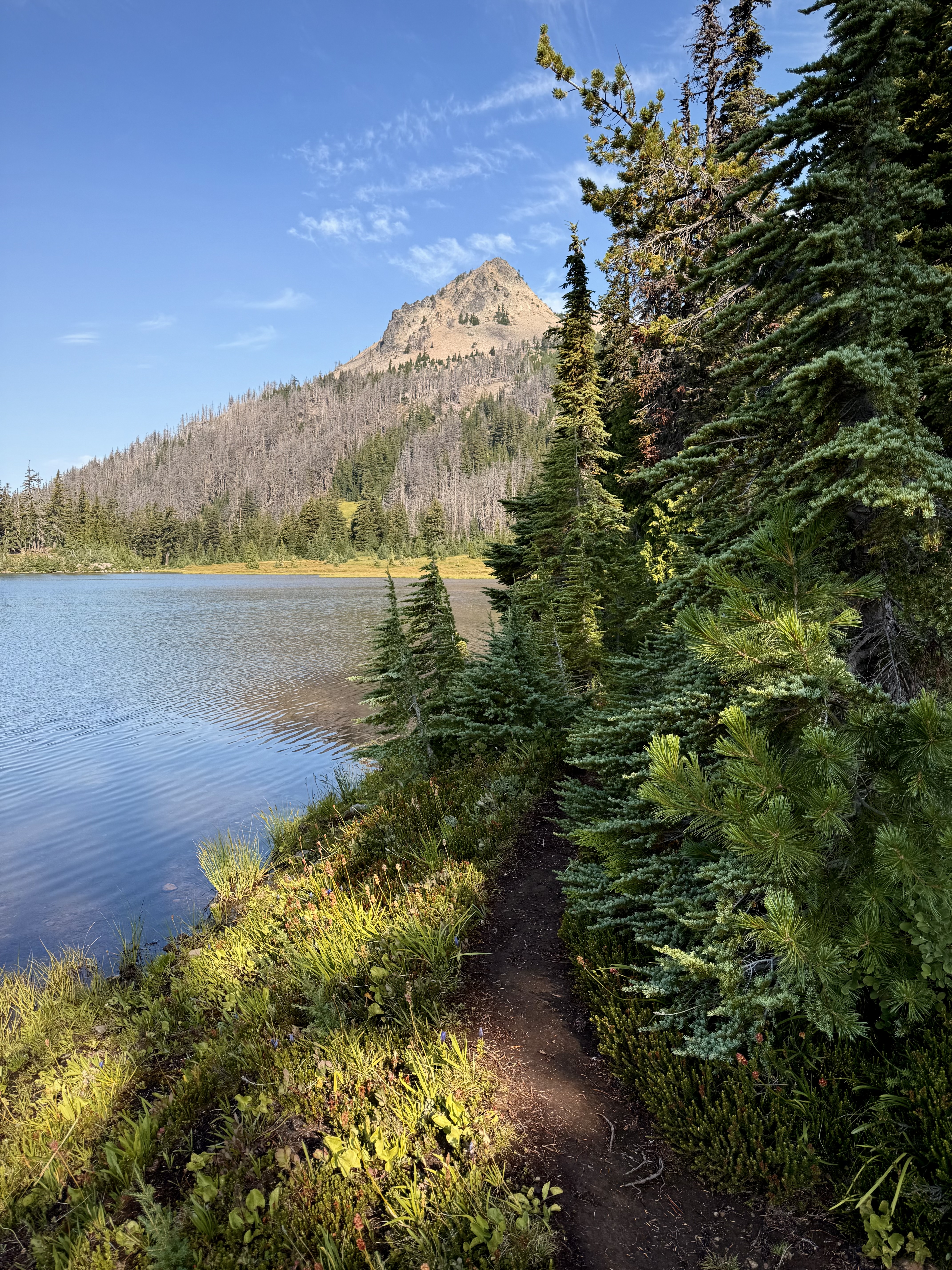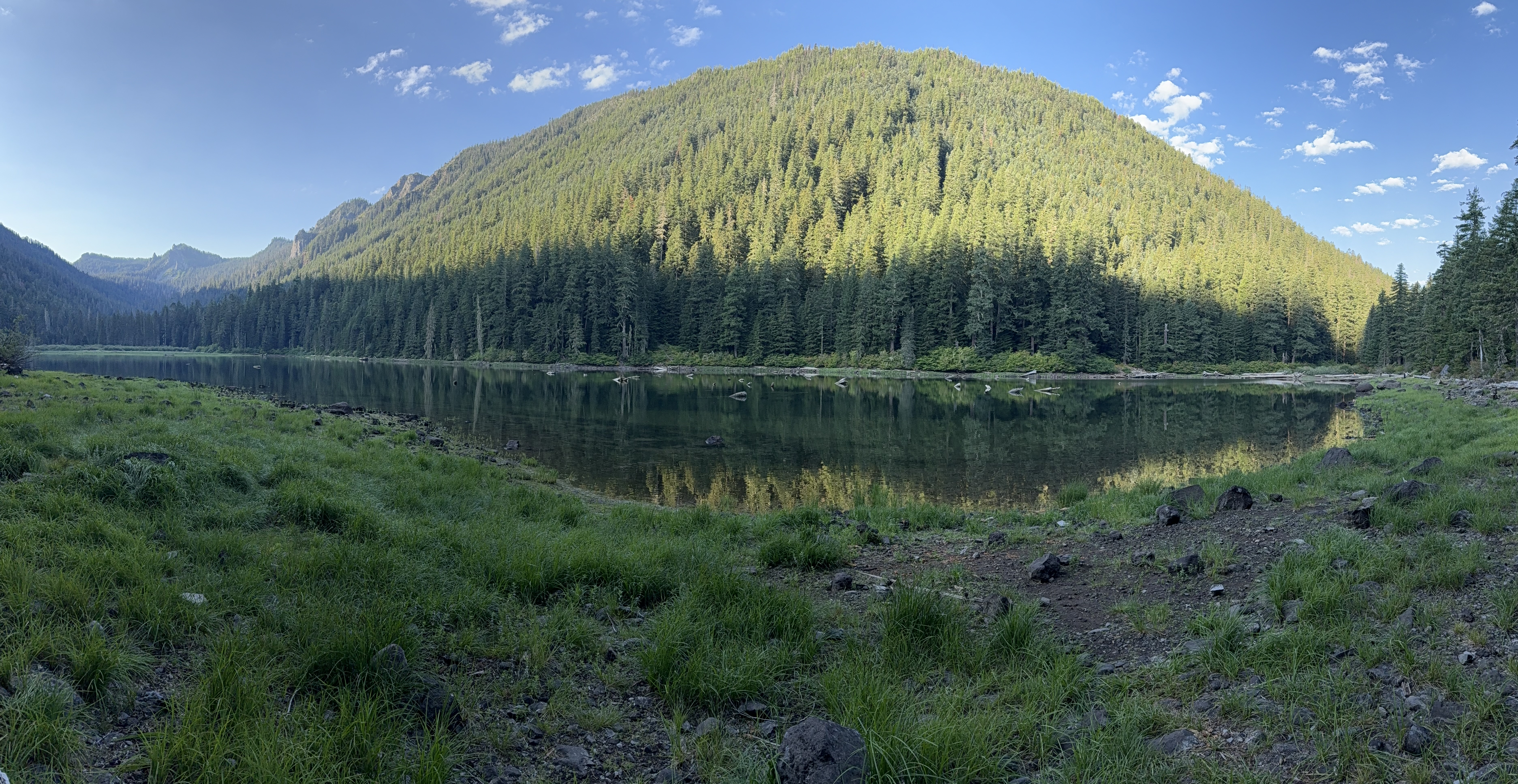 It was a wonderful and spacious campsite. Beautiful big fir trees on a little point on the quiet tranquil lake with a splendid view of Mount Jefferson, and away from others… perfect.