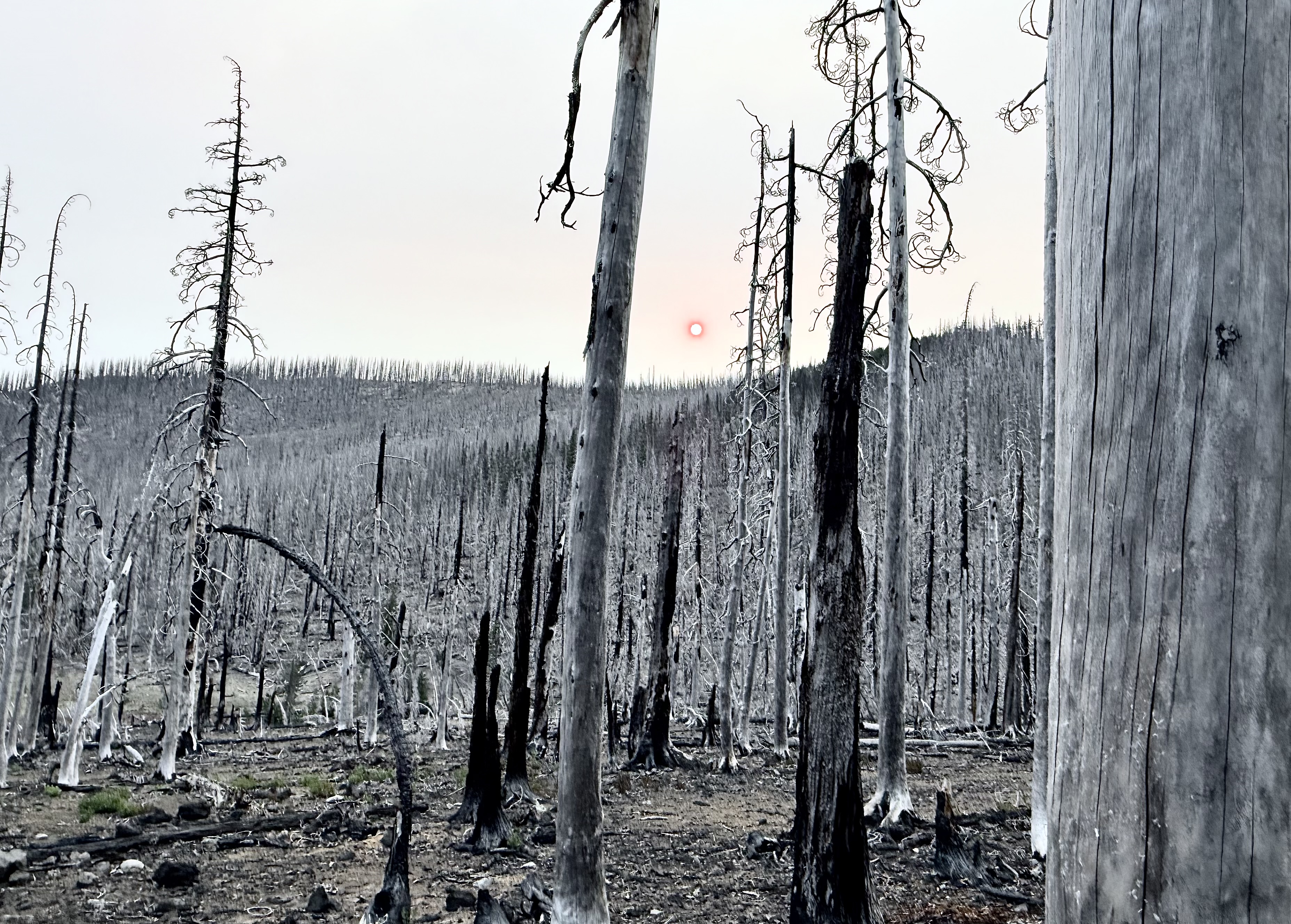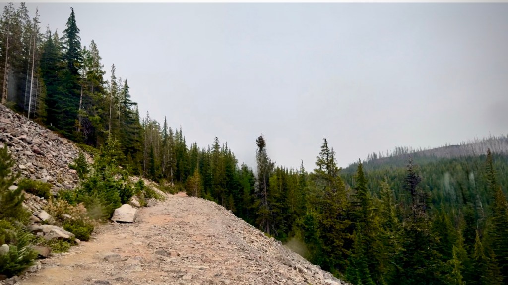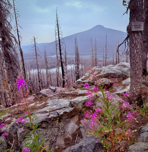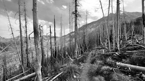 On and on through the devastation we trekked as far as I could see, and I could see pretty far. There was burnt timber everywhere and add to that I could see smoke from the active fire in the Sisters, Oregon area blowing up the valley and hoped that would not choke us out. I pondered about our safety and how that fire fight was going since we were more or less out of touch with the rest of the world. All of the timber that surrounded us had already burned once I imagine it wouldn’t burn again, but then again it’s a lot of wood, right?