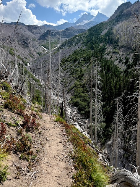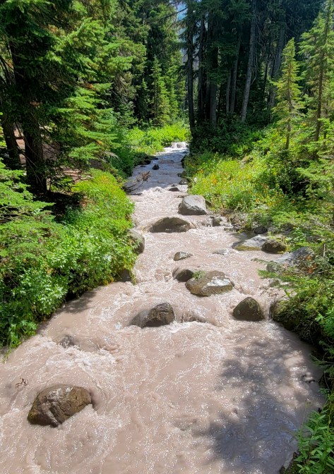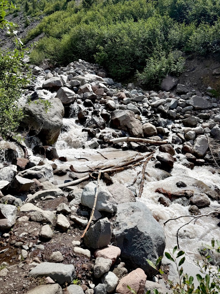 We crossed over a stream that seemed to be flowing with milk and honey. The aptly named “Whitewater Creek”. The chalky color is actually a fine silt mixed into the water coming down the mountain from the glacier. Not the place to be filtering water so it is important to plan accordingly.