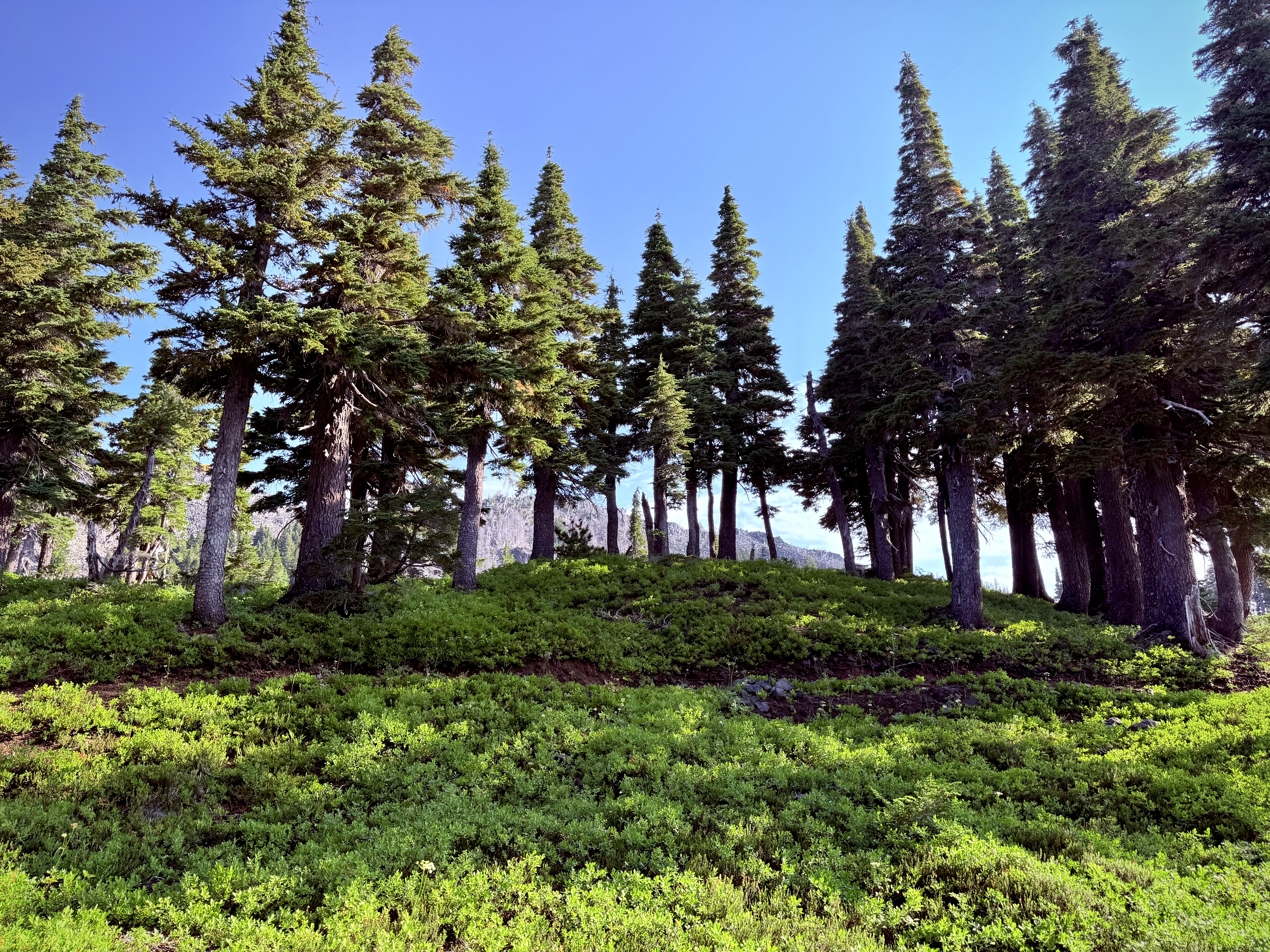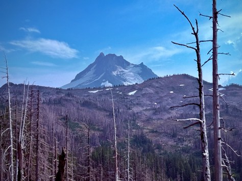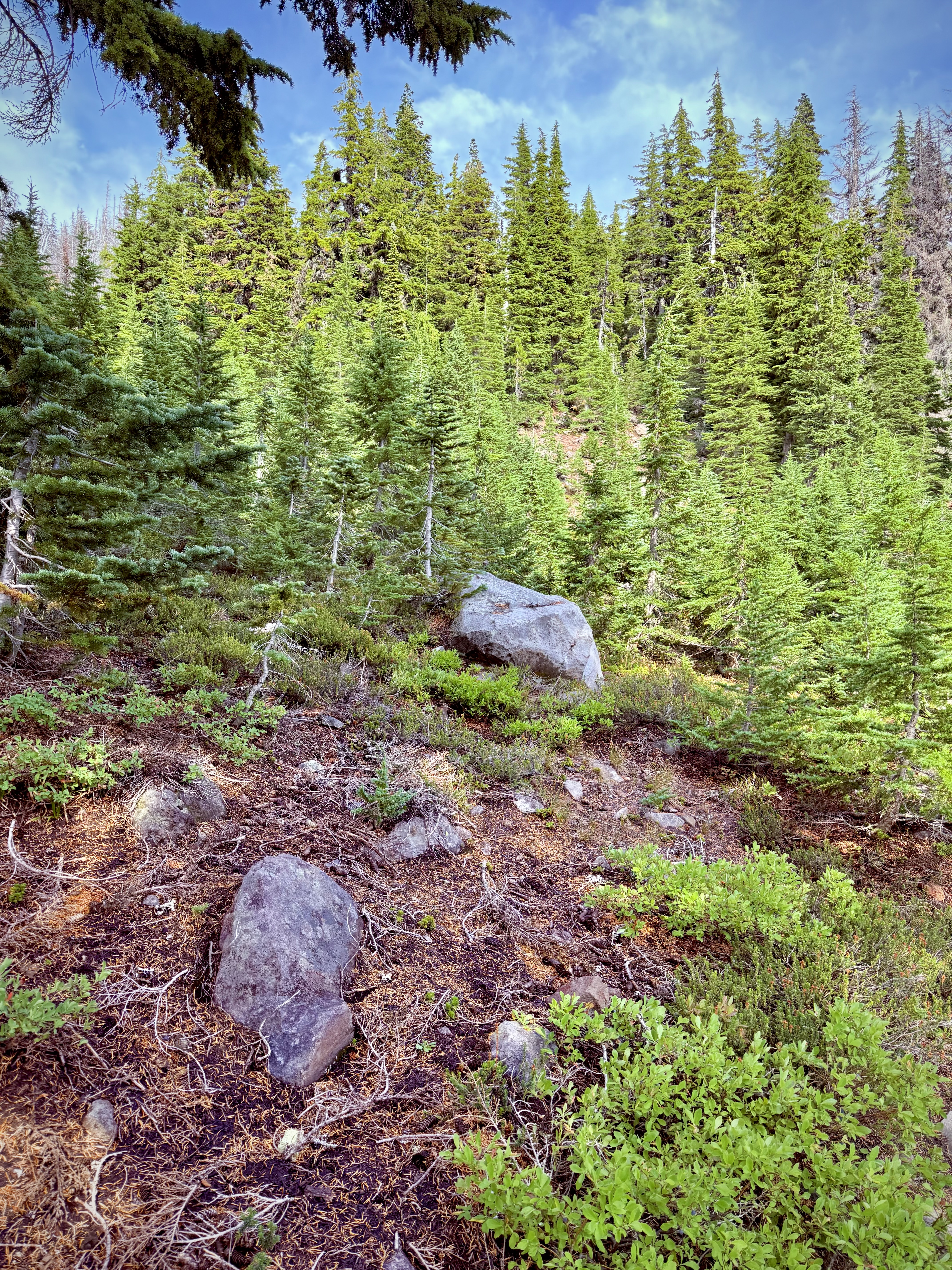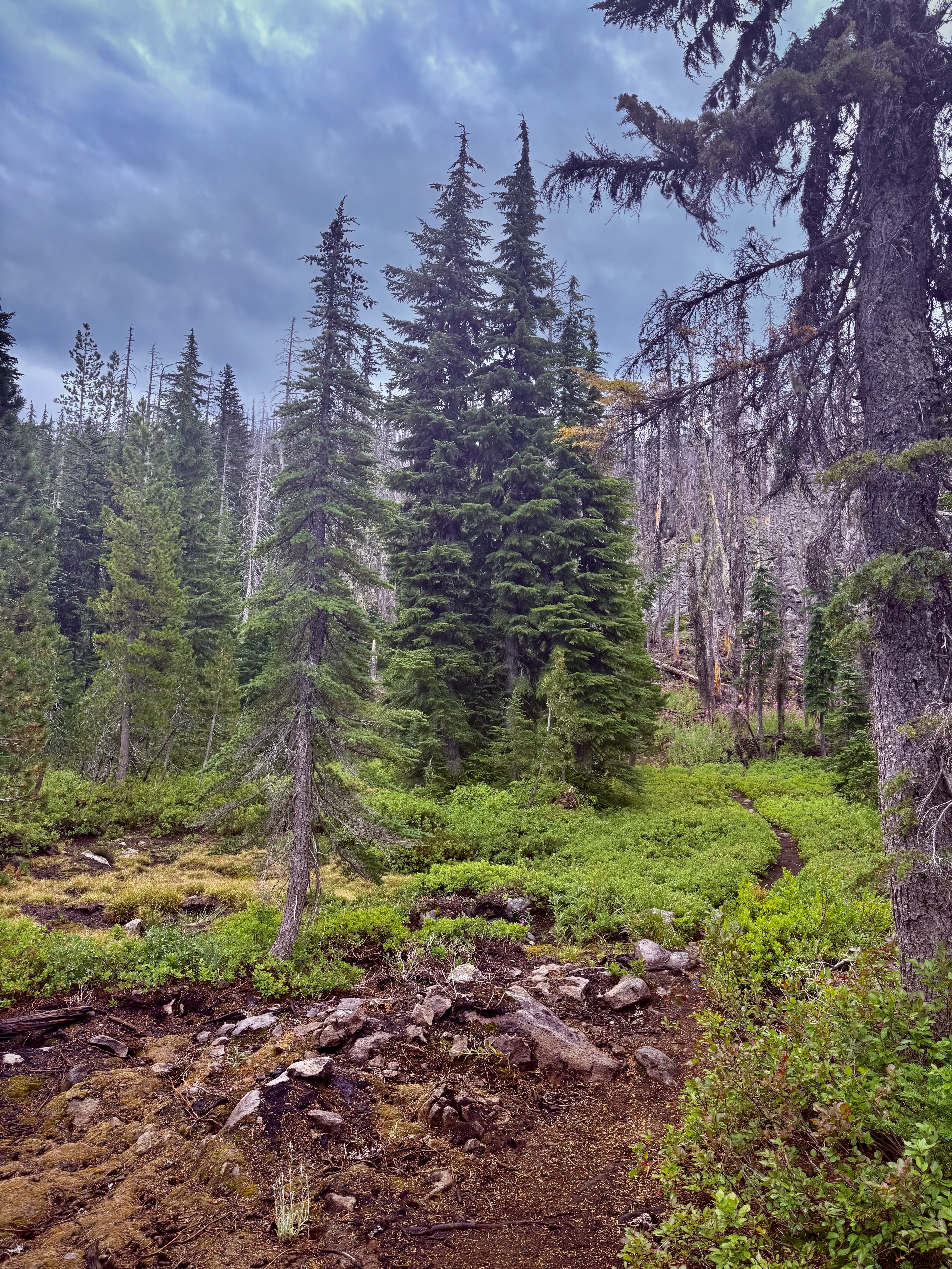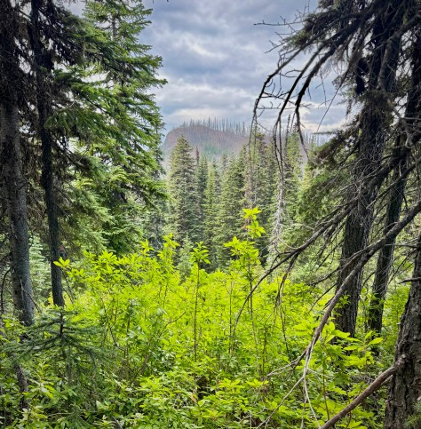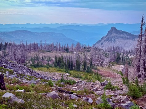 The alluring perfect forest ran out as we wrapped around the mountain. Back to the burn scar, ugh, but I did find some bushes filled with huckleberries and took a nice long break harvesting as many of the delicious tidbits for my breakfast snack as I could muster.