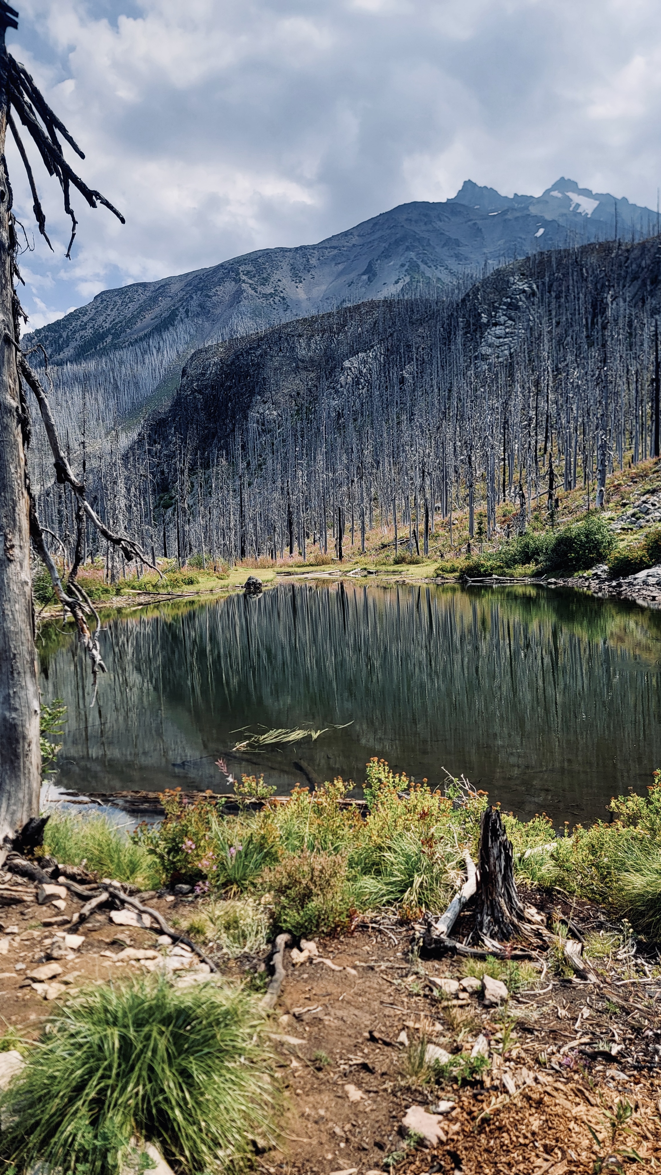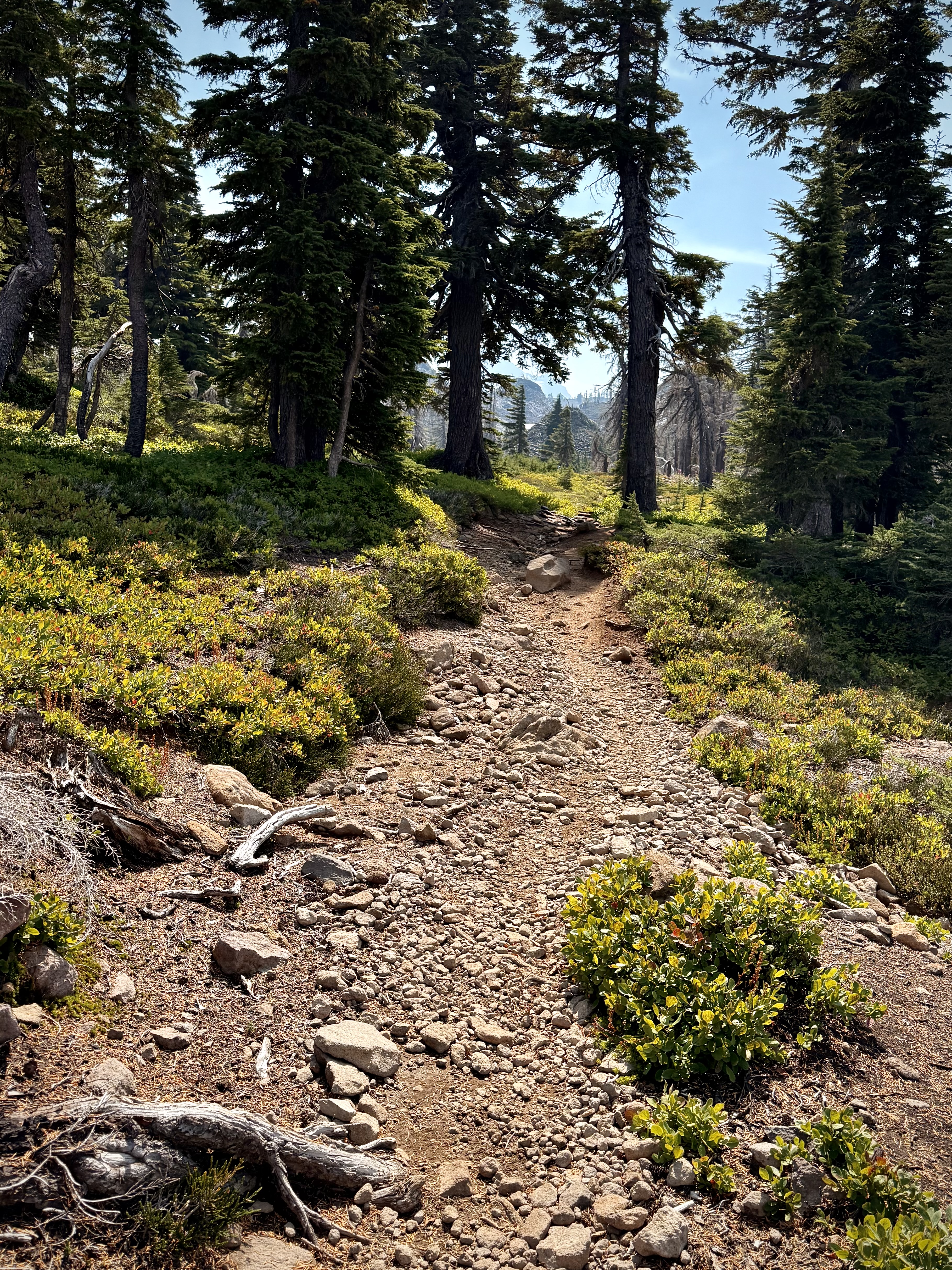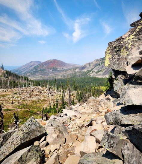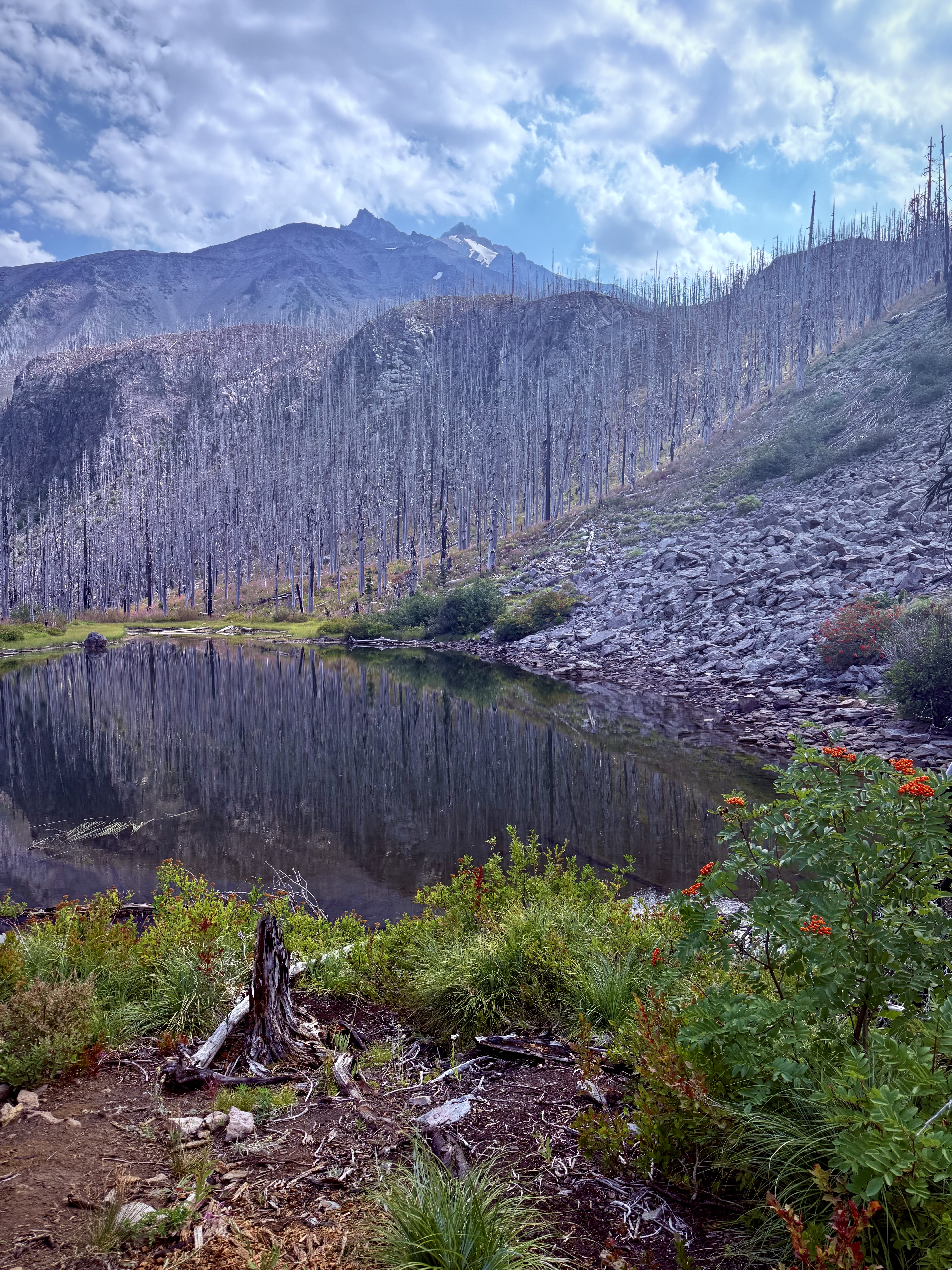 The alluring perfect forest ran out as we wrapped around the mountain. Back to the burn scar, ugh, but I did find some bushes filled with huckleberries and took a nice long break harvesting as many of the delicious tidbits for my breakfast snack as I could muster.