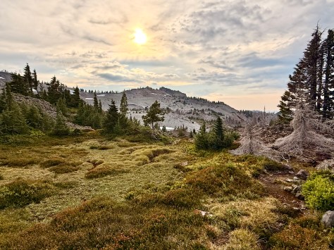 We survived the horrendous thunderstorm the night of ‘Mount Jefferson Wilderness, Day 1, that surprised us in the middle of the night on top of the Park Ridge. The rain came down in buckets with lightning bolts all around.
