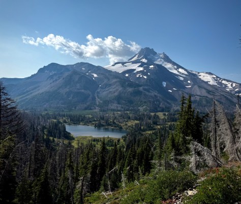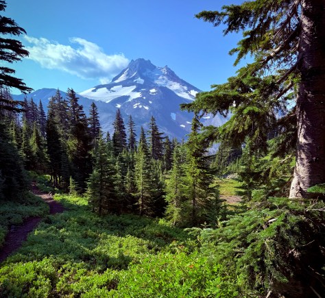 I decided since I was the one that was struggling with the demons of a heavy pack, not enough food and not enough nutrition, according to my trail mates, that I would set out early on my own. My own feelings of self doubt weighing heavy on my mind. Did I train hard enough? What is my frick’n problem? Why am I so slow compared to the others? Why am I struggling? We aren’t even at a high altitude for goodness sake. But of course I was headed downhill now so there was not the same strain and effort. So this day certainly felt better and less of an endeavor than the previous day. Plus the area was absolutely breathtaking from the marvelous views of Mount Jefferson to the thick lush forest that I was now traveling through. The others would not catch me on this part of the trek as I made my way down at a brisk clip enjoying nature and all her bounty.