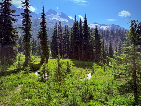 I made my way downhill through the forest and along a couple of alpine meadow open areas to our meet up spot far down below at Russell Lake.