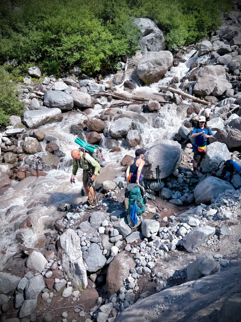 Really sketchy water crossing at Elliot Glacier Stream…  Wading in thigh deep fast moving cold water can be a bit unnerving with a water fall drop just 15 yards away.  The thought goes through your mind it should be fine, but what if it’s not?  What if your feet get swept by the fast moving current and slippery rocks? The other thing is you are going to have soaked boots for as long as it takes for them to dry out, which ended up a long time.  It turned out that it was fine.  Except for the wet boots part… Then it was a crazy steep scramble out where everything was moving including chest size boulders.  I cut my knee and shin on the scramble, so I either looked bad-ass or like a ding-dong with blood running down the length of my lower leg.