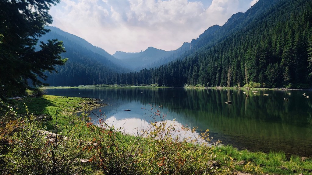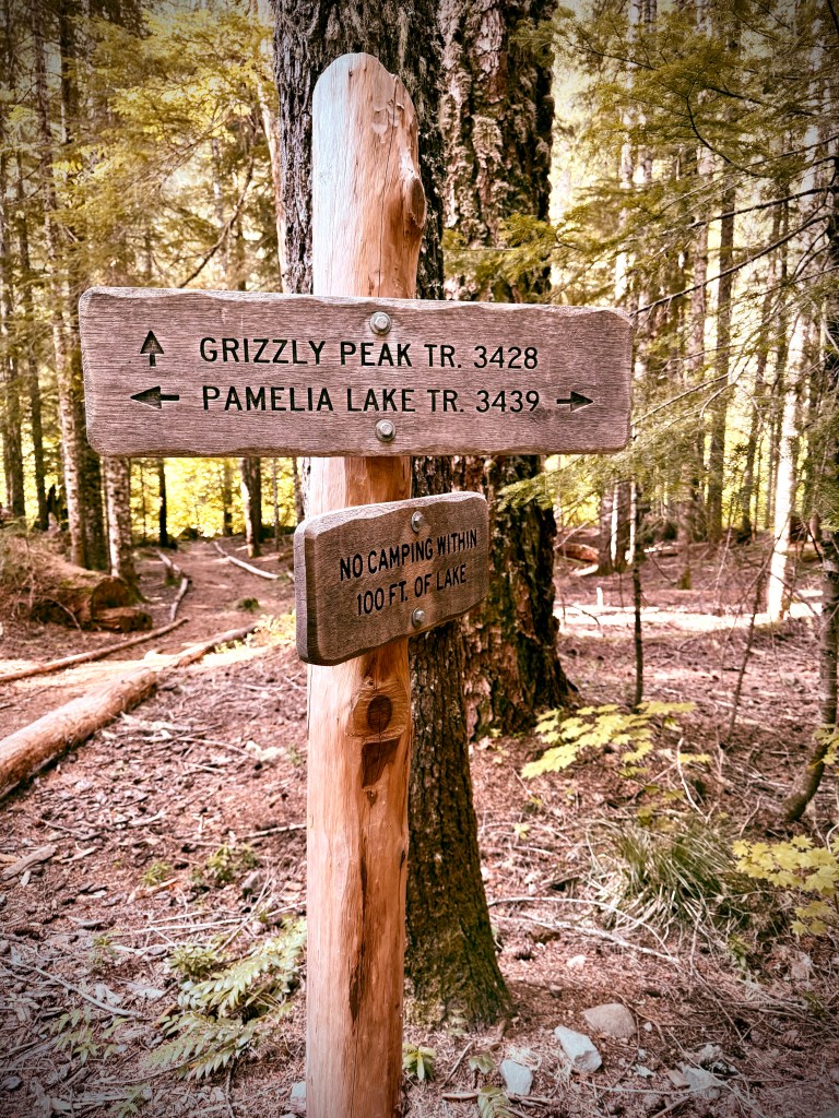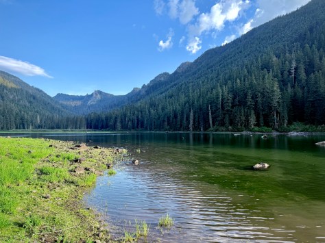 How pleasant the hike became at that point as we were in the sort of environment that PNW forests are known for big, bountiful and beautiful fir trees. We made our way to Pamelia Lake where we saw some other folks enjoying camping by a lovely alpine lake. We knew that Anthony would be searching for just the right spot. We made our way through the thick woodland along the banks of the pretty lake. On our side of the lake was thick forest the same for the other side other than that backdrop was steep mountainside leading up Grizzly Peak.