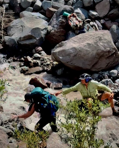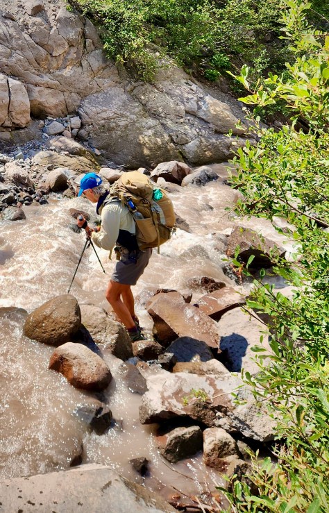 Dale an outdoorsman all of his life took the initiative and carefully made his way through the rushing water securing each step as he went and using his trekking poles to brace himself. Once across he gave instructions to the others. Anthony made a couple of attempts, but really did not like it so he was still deciding how he wanted to cross plus he wanted to make sure that Katie would be okay on the crossing. Dale anchoring himself by sitting down on a boulder partially in the water to give assistance with directions. Katie was next. Dale showed her the best spot and where to place her feet, informing her that the rocks were slippery. It was a little sketchy, but Dale reached out his hand and she was able to make a lunge at it and all went well. The others followed suit.