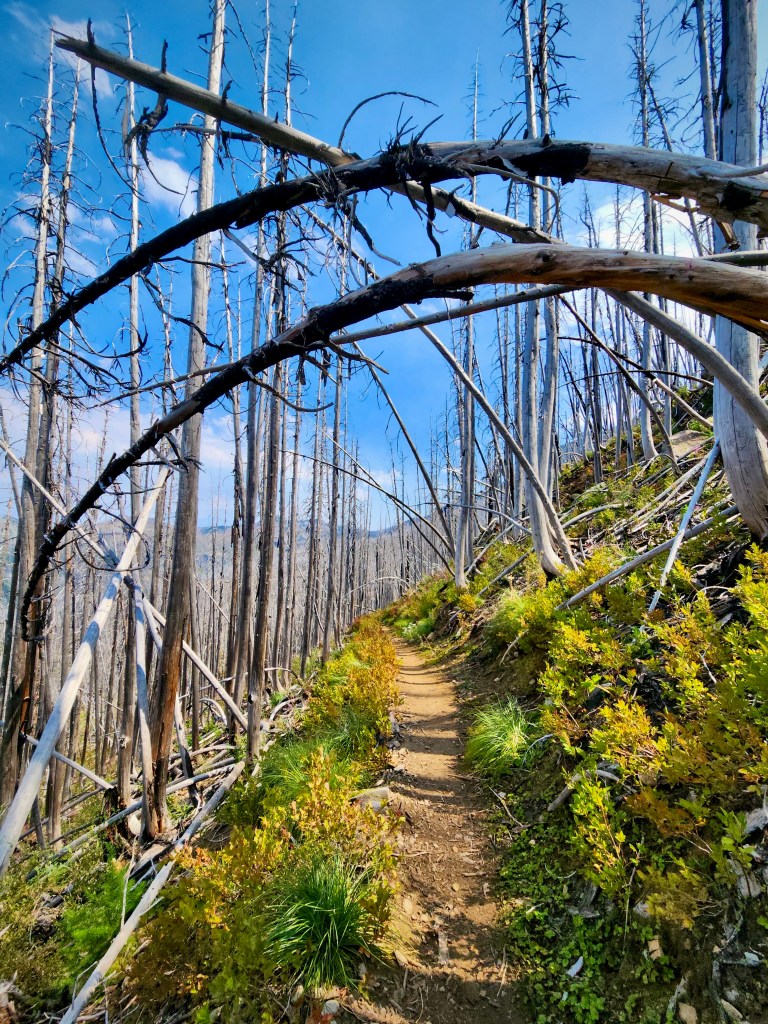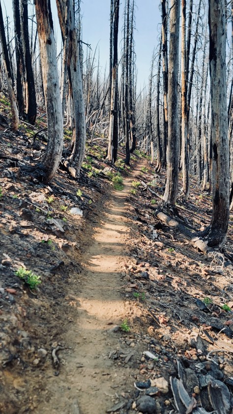 The next portion of the hike we did not really capture images of as it was just so disappointing. That segment was simply unbelievable devastation. The wildfire took out everything as far as the eye could see and we could see a longways from this sad vantage point. Every hill, every mountain, every valley, everything… just scarred dead timber.