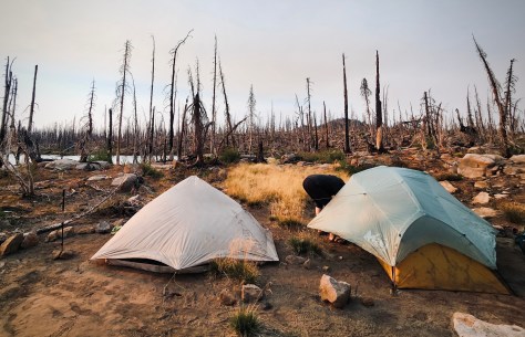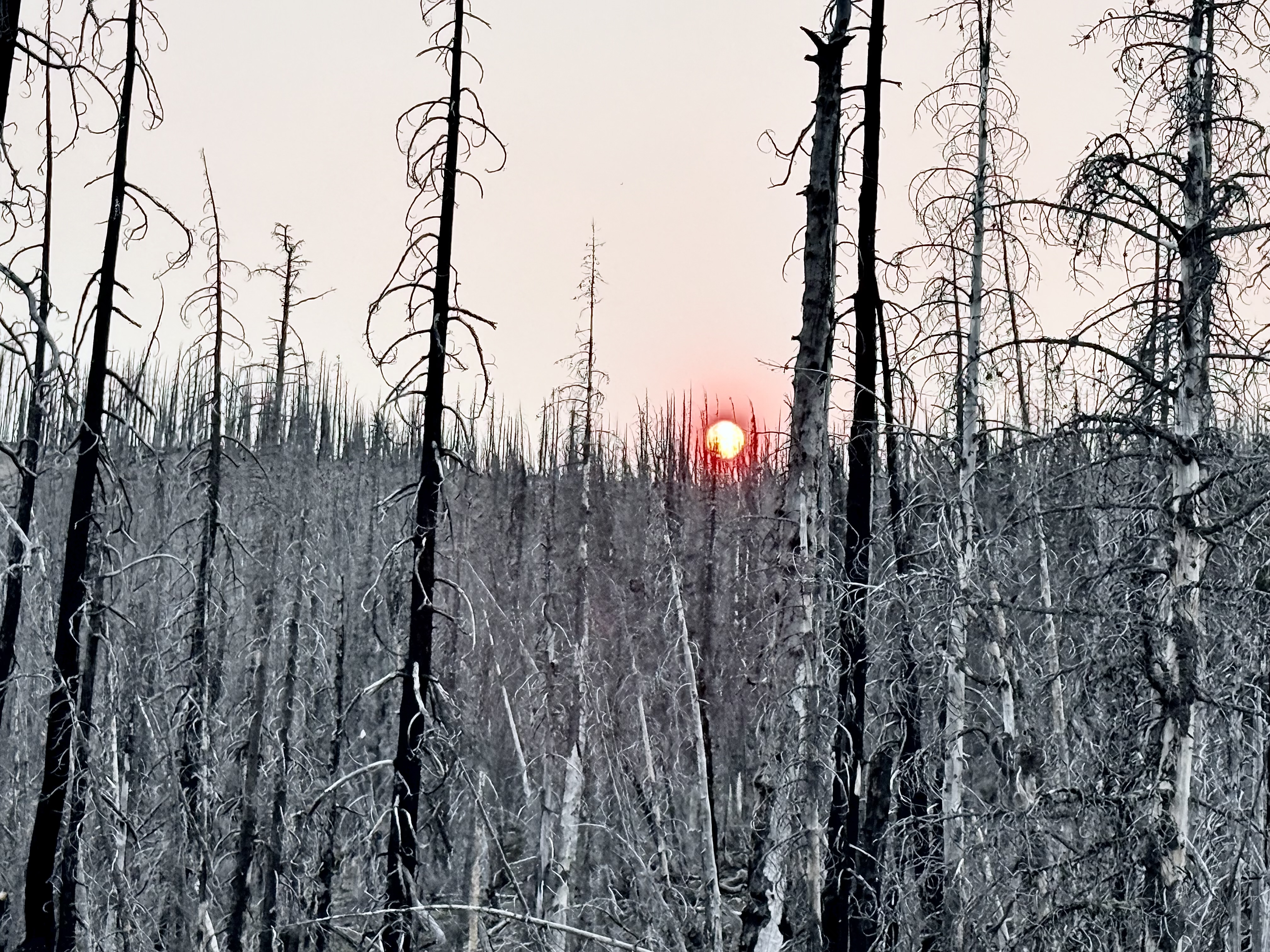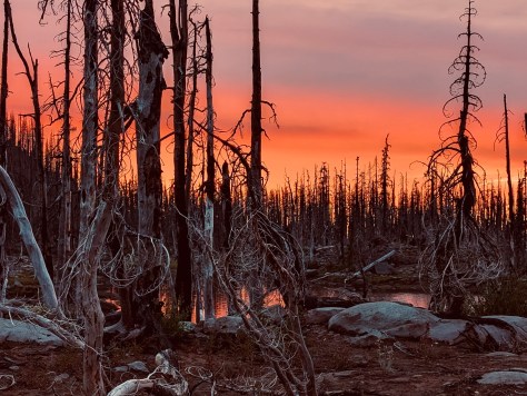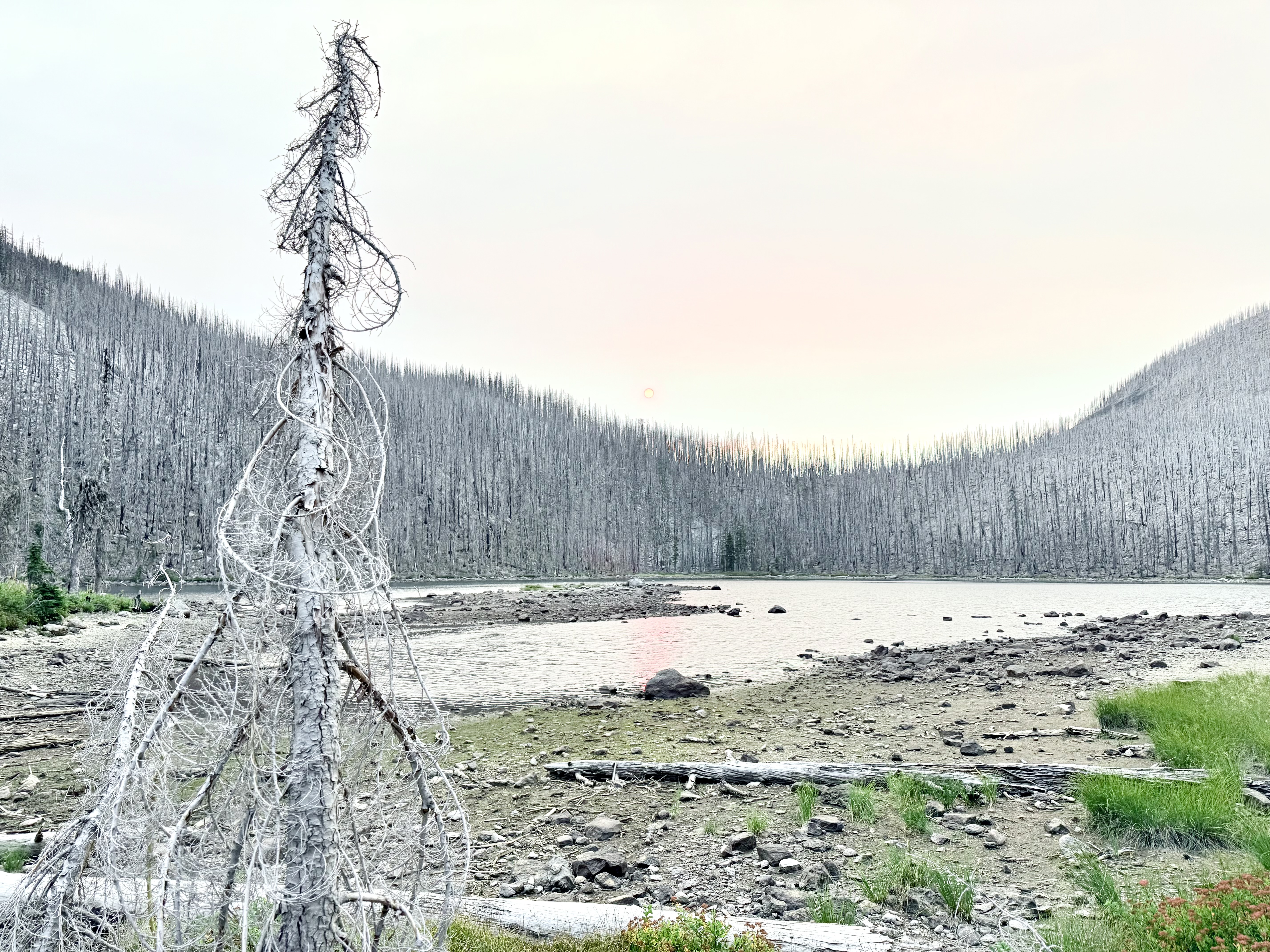 We finally pulled into where we were pitching our tents for the night. Cigar Lake, I am sure was named because of it’s shape, but I was thinking that it was ably named as it was all burned up. This Hades was surely the worst spot I have ever camped. The toppled timber was barren and black strewn about like matchsticks and the ground was ash. The smoke from the Sister’s Fire was choking out the sun giving it the appearance of a glowing red ball. It was an eerie apocalyptic setting.