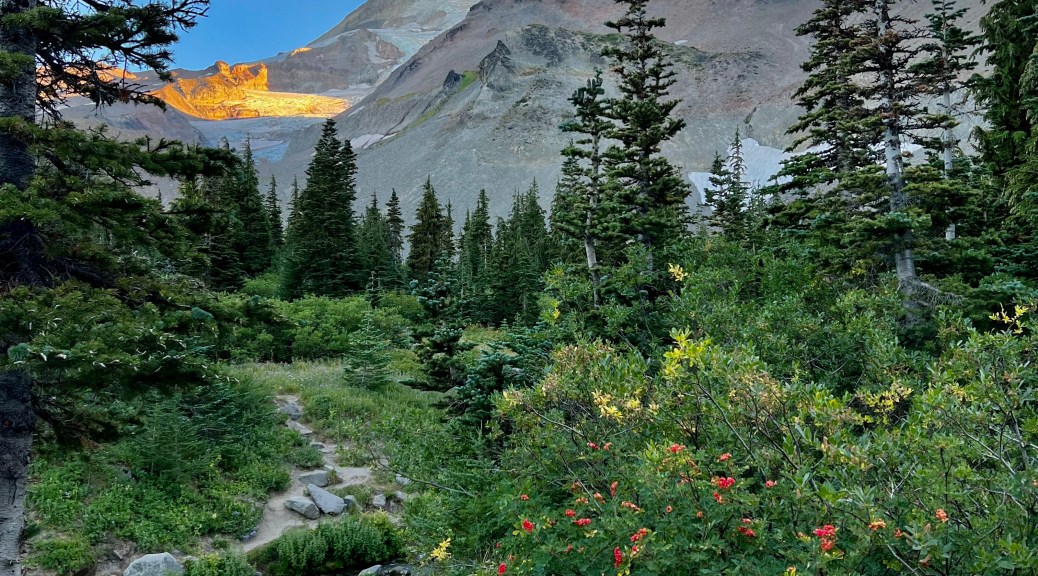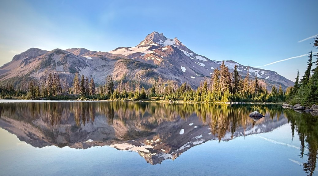 The glaciers on the mountain pick up the soft light of early morning… the still waters of the alpine lake reflecting the regal presence of Mount Jefferson… this place of calm framed by towering firs is a quiet reminder to appreciate the richness of the moment.