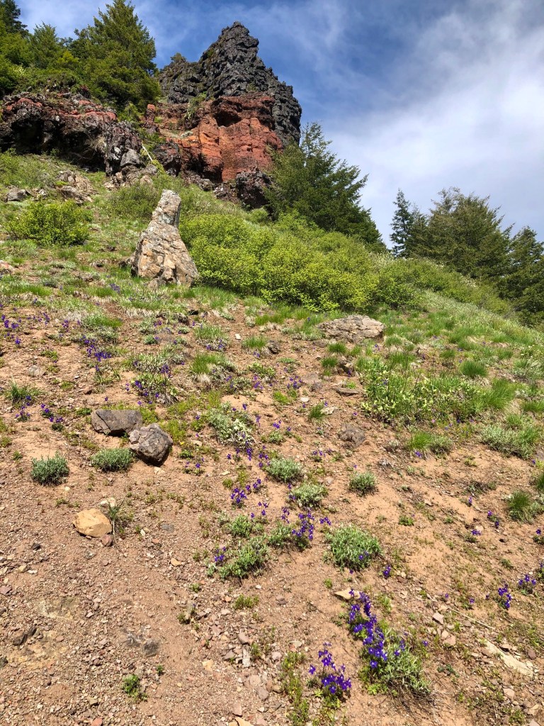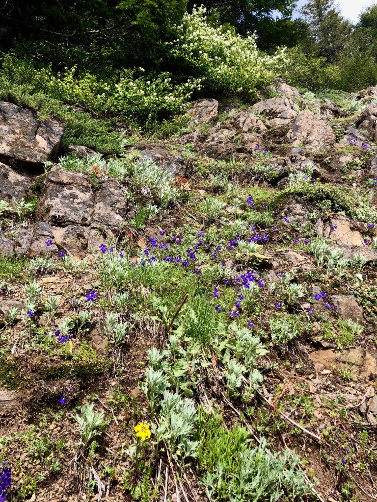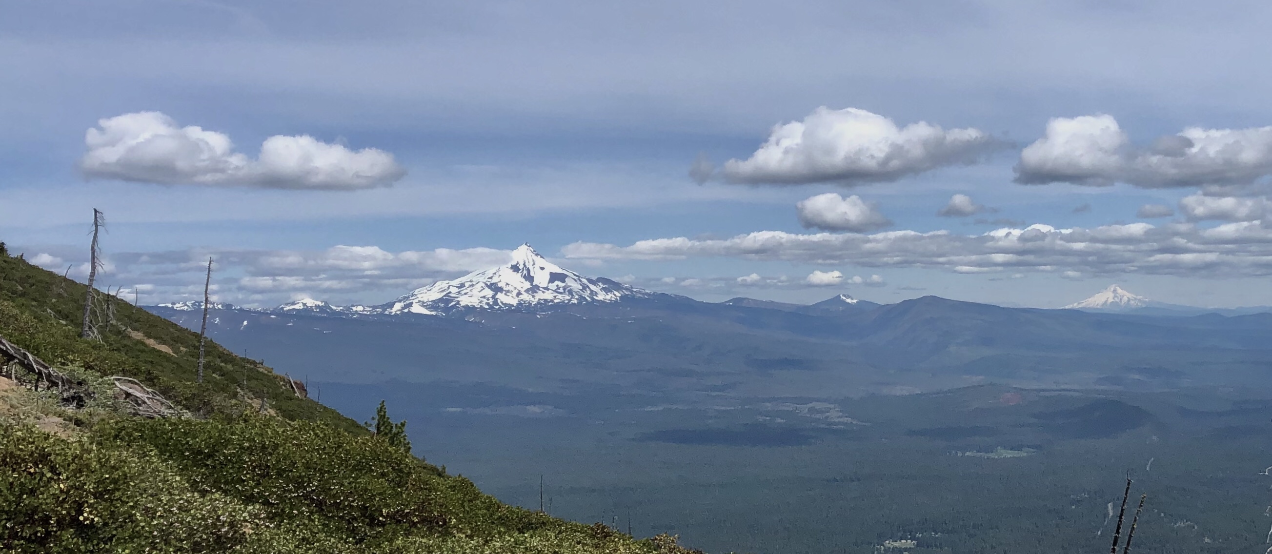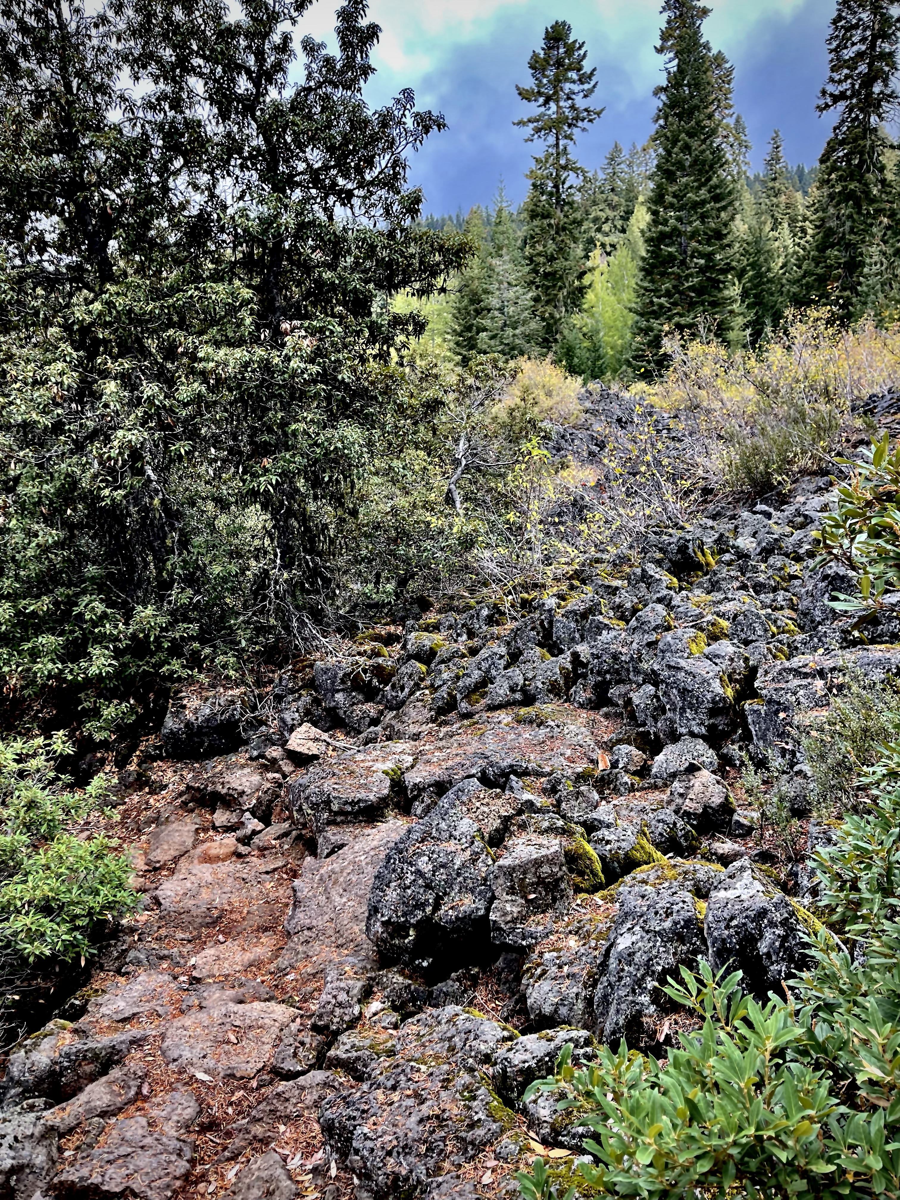 The alluring perfect forest ran out as we wrapped around the mountain. Back to the burn scar, ugh, but I did find some bushes filled with huckleberries and took a nice long break harvesting as many of the delicious tidbits for my breakfast snack as I could muster.
