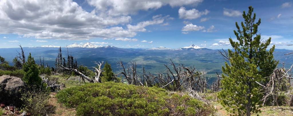 On and on through the devastation we trekked as far as I could see, and I could see pretty far. There was burnt timber everywhere and add to that I could see smoke from the active fire in the Sisters, Oregon area blowing up the valley and hoped that would not choke us out. I pondered about our safety and how that fire fight was going since we were more or less out of touch with the rest of the world. All of the timber that surrounded us had already burned once I imagine it wouldn’t burn again, but then again it’s a lot of wood, right?